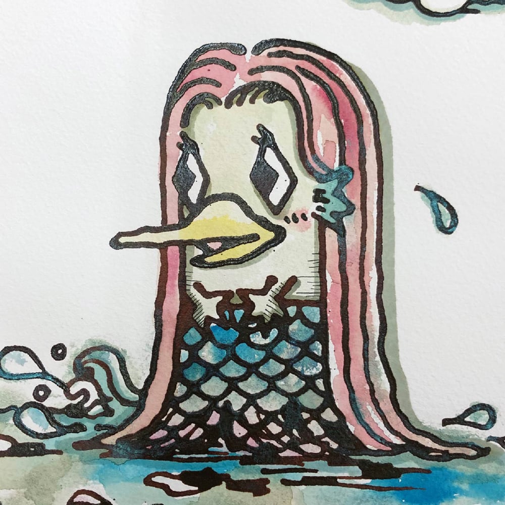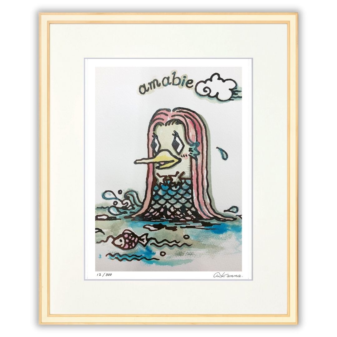 「アマビエ様」は、日本の伝承に登場する妖怪をモチーフにしたユニークなアート作品です。波間から姿を現す長い髪の人魚のような姿に、くちばしや鱗を持つ不思議な存在は、古くから「疫病退散」の象徴として親しまれてきました。淡い水彩の色彩と柔らかい線描きにより、伝統的な題材でありながらもどこか親しみやすく、愛らしい表情が印象的です。背景に描かれた水しぶきや泳ぐ小さな魚が、アマビエの世界観を引き立て、観る人の心をほっと和ませる作品です。