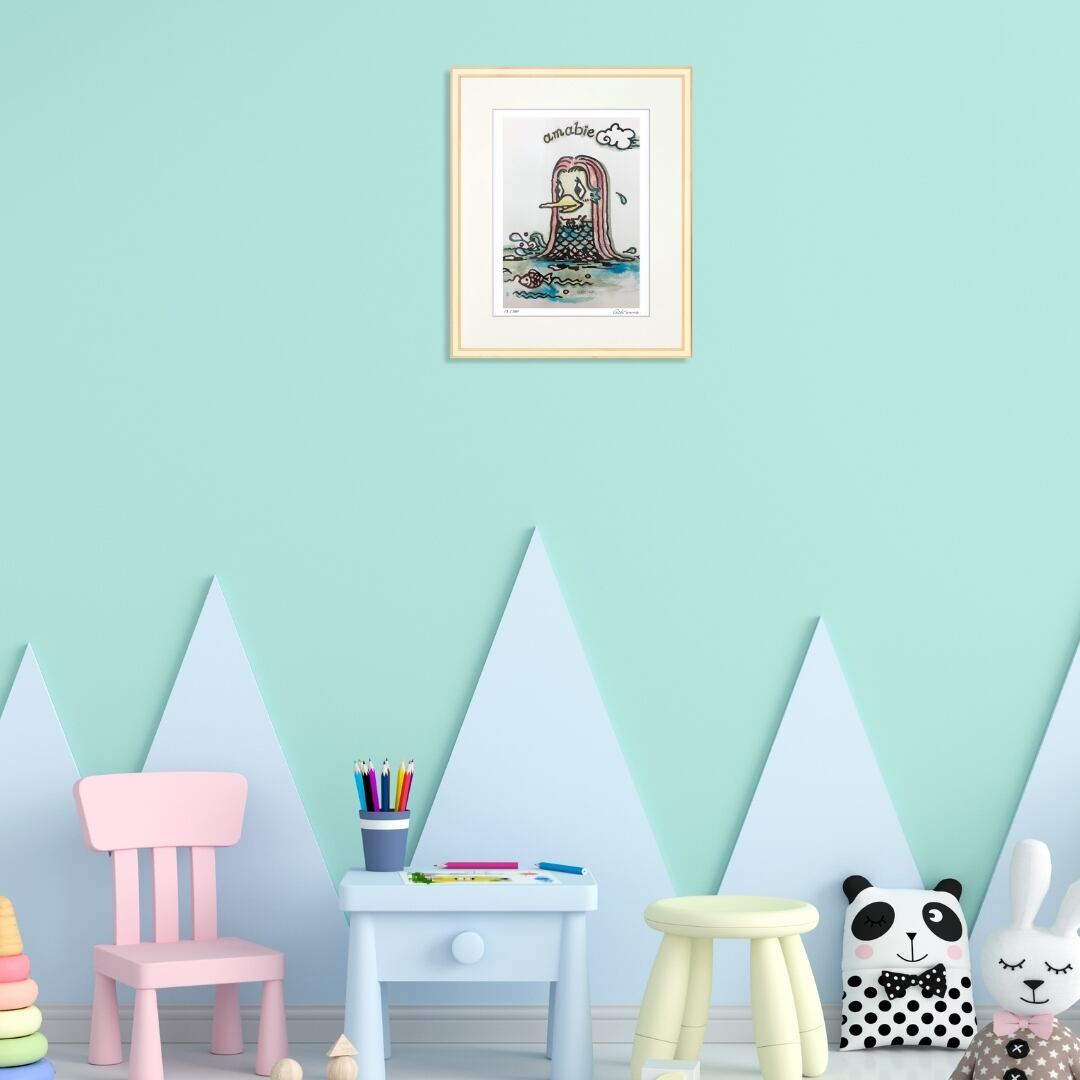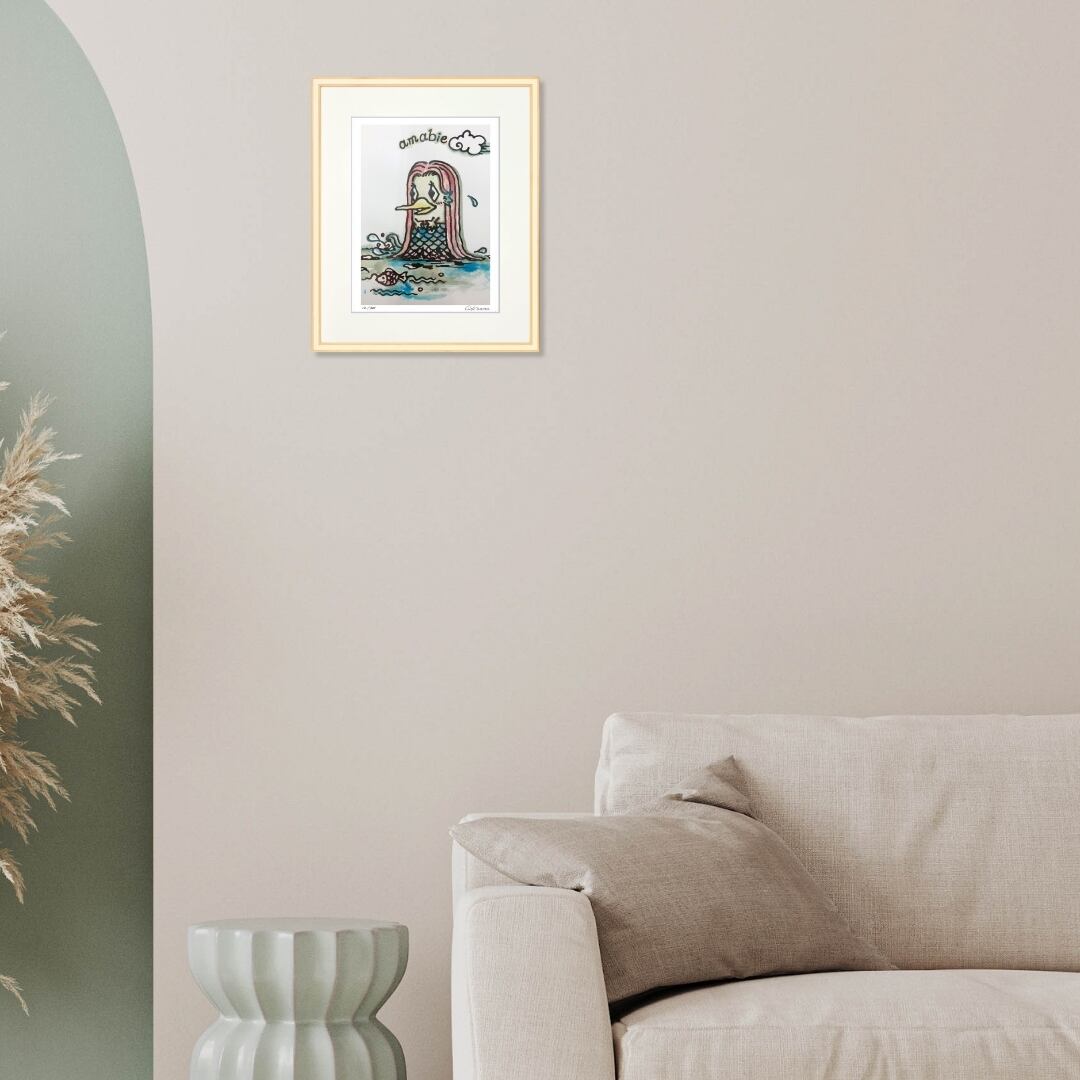 この作品をお部屋に飾ることで、明るく前向きな気持ちを運び込むことができます。古くから「厄除け」「疫病退散」として信じられてきたアマビエは、お守りのような存在となり、毎日の暮らしに安心感を与えてくれるでしょう。優しい色合いとユーモラスな表情は、リビングや玄関など人の集まる場所にぴったりで、訪れる人との話題づくりにもなります。アートを通じて伝統的なモチーフを身近に感じられる、癒しと守りの両方を兼ね備えたインテリアアートです。