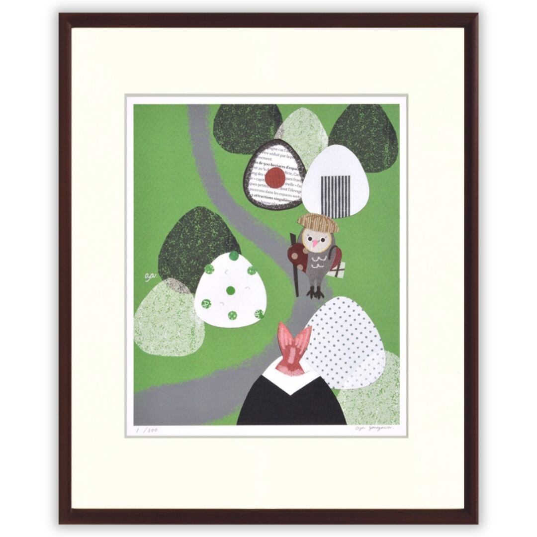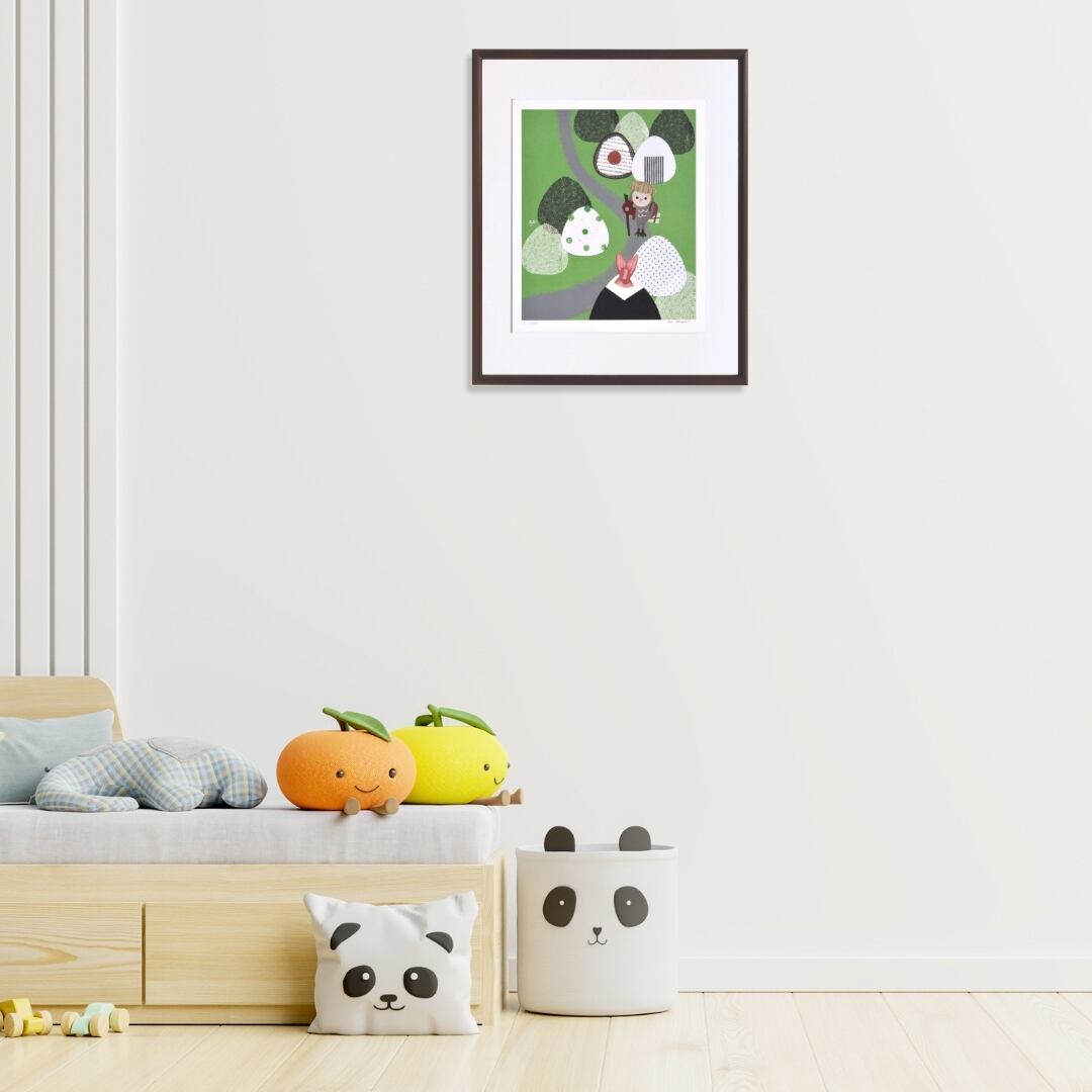 緑豊かな道を進む中、可愛らしいおむすびたちが並び、まるでユーモラスな街道を描いたような世界が広がります。おむすびの模様や形がそれぞれ個性的で、遊び心のある表現に思わず微笑んでしまう作品です。小さな旅人の姿も加わり、にぎやかで温かい日常のひとこまを想像させます。作品全体から伝わるのは素朴さと楽しさの調和で、見る人を童心に帰らせてくれるような魅力があります。