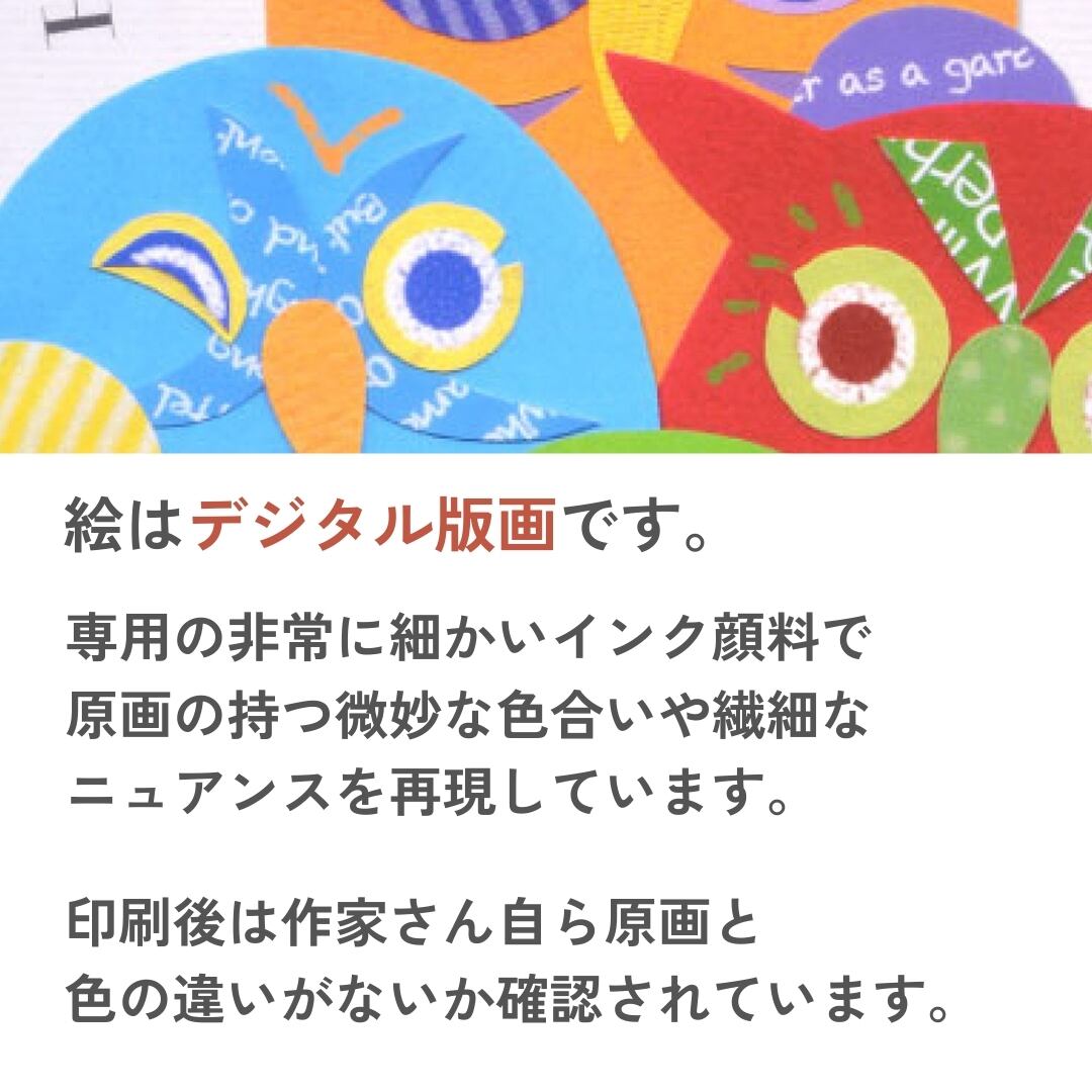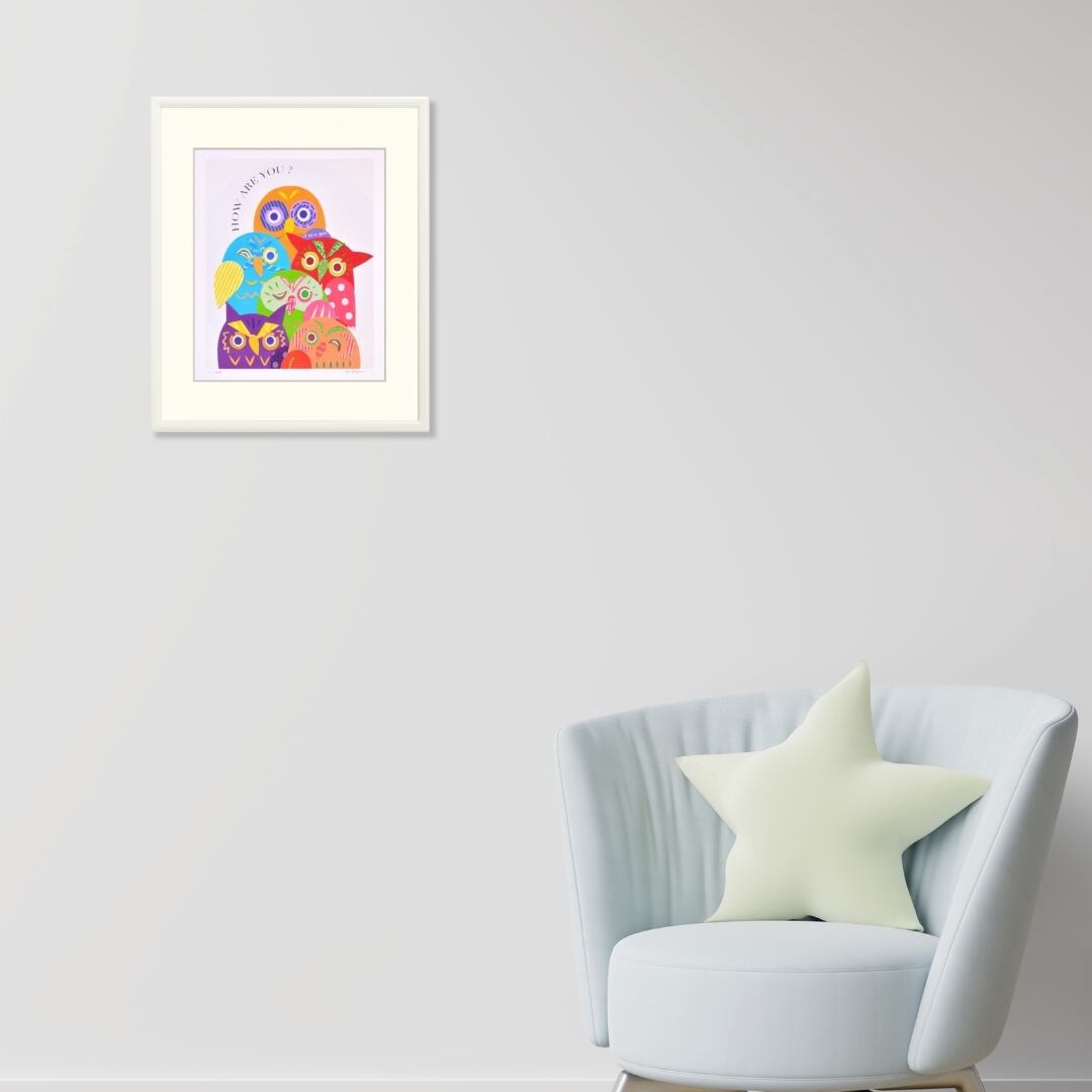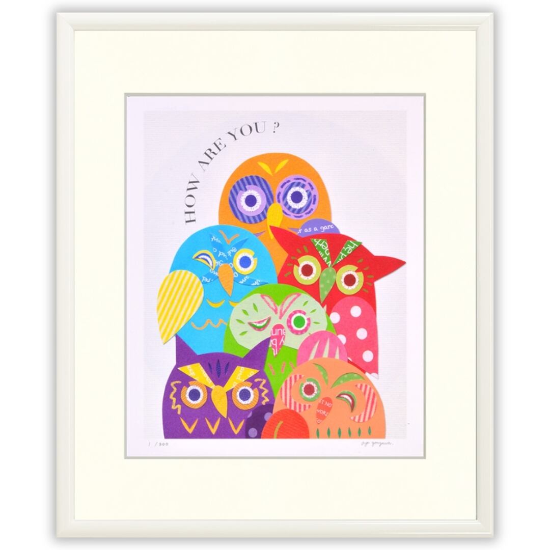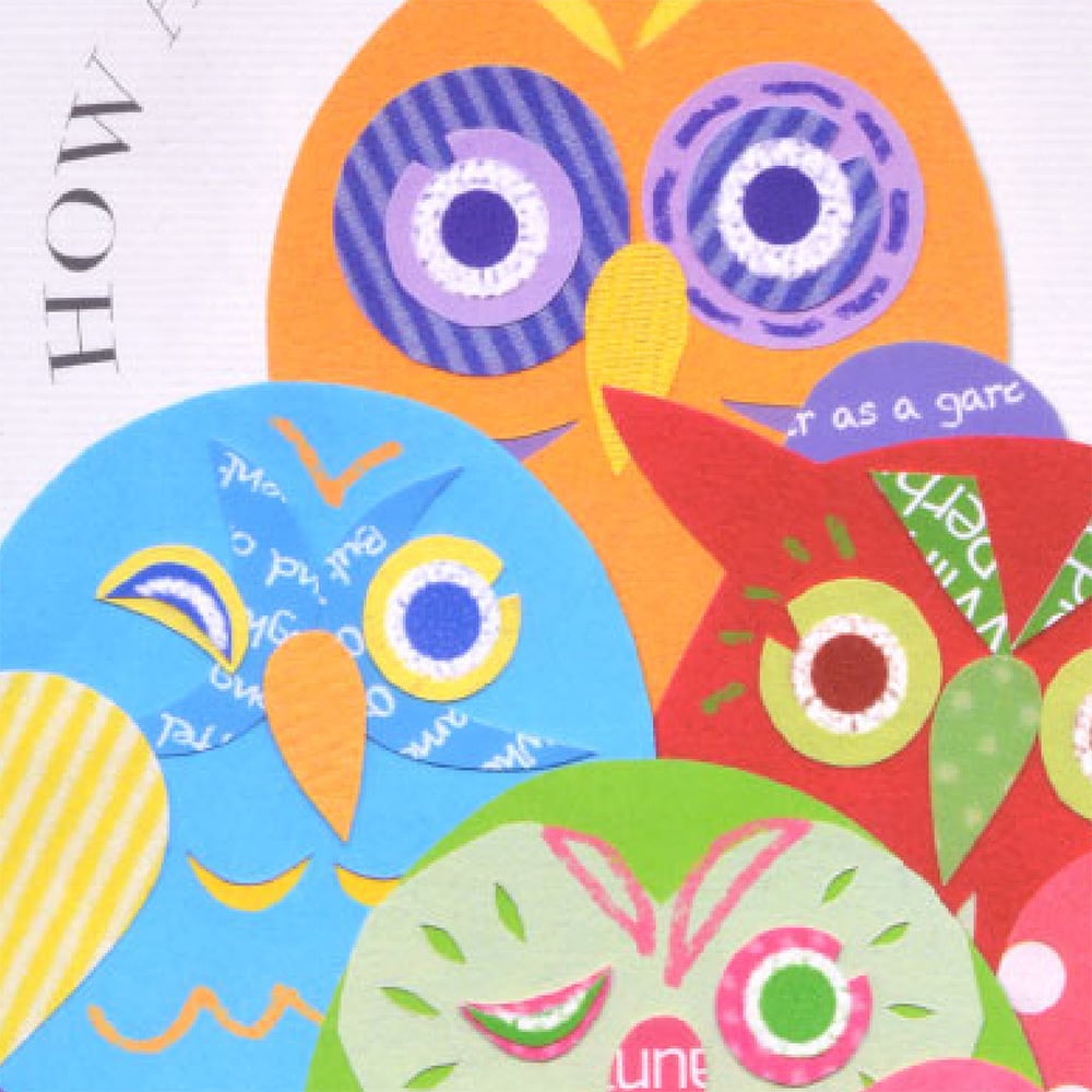 色鮮やかなフクロウたちが仲良く集い、問いかけるように「How are you?」の言葉が添えられています。ポップで遊び心あふれる表情と配色は、まるで陽気な会話が聞こえてきそうです。紙の切り絵ならではの質感が重なり合い、立体感や温かみを感じさせる仕上がりになっています。見ているだけで元気をもらえるような鮮やかさが魅力のイラストです。