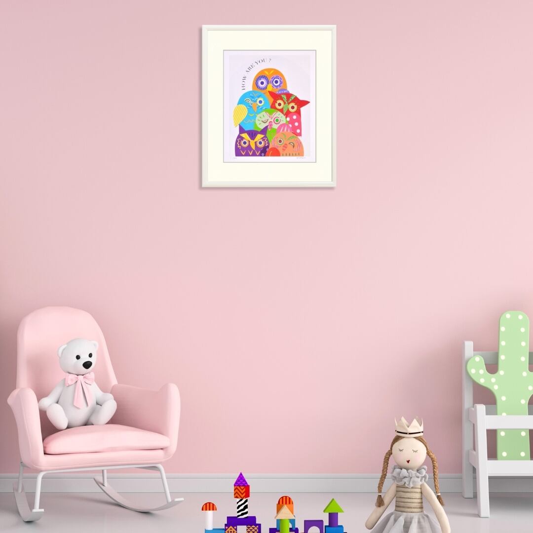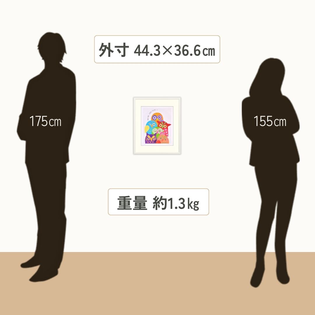 カラフルなフクロウのイラストは、壁に飾ることで一気に明るい雰囲気を演出してくれます。額入りアートとして仕上げられているため、そのまま飾るだけでリビングや子ども部屋を楽しく彩り、日常に遊び心をプラスします。インテリアアートとしても存在感があり、来客との会話のきっかけにもなります。ポップなデザインは幅広い空間に調和し、暮らしに彩りとユーモアを届けてくれる一枚です。