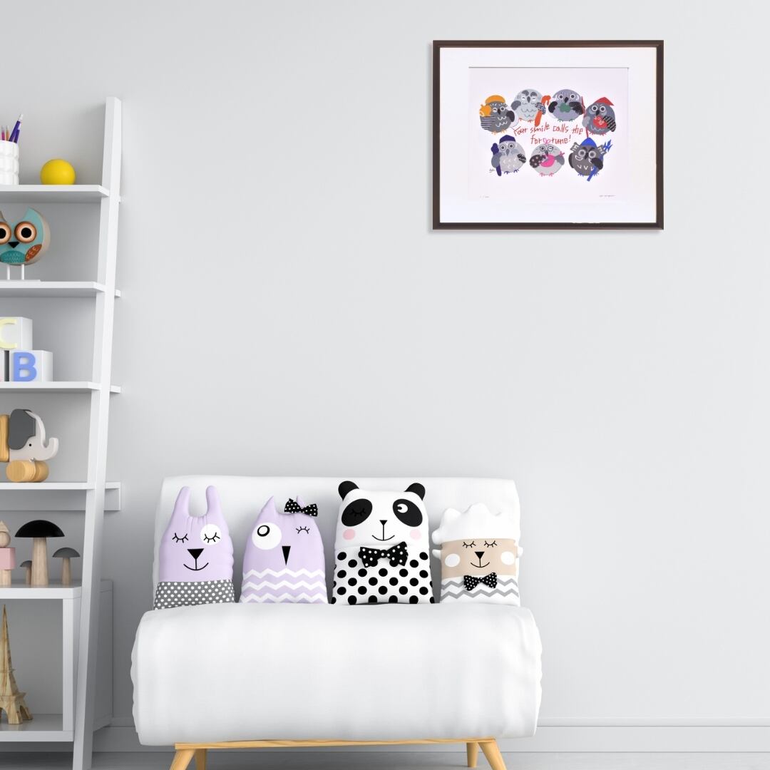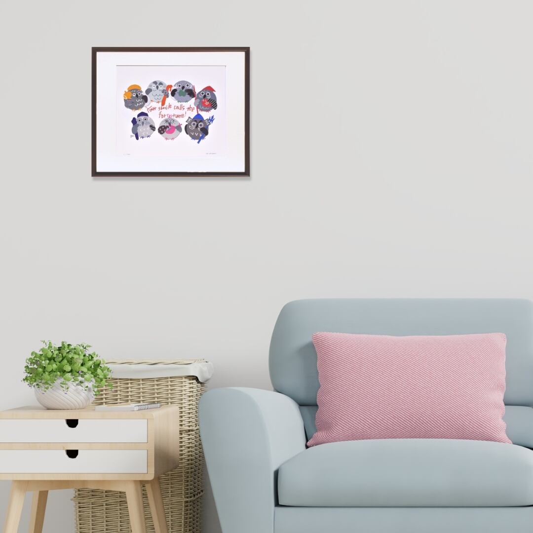 ふくろうは「福来郎」とも表され、幸福や知恵の象徴として親しまれてきました。そのモチーフをカラフルに描いたイラストは、インテリアアートとして空間に親しみやすさと明るさを加えます。額入りアートとして仕上げられているため、玄関やリビングに飾れば訪れる人の目を楽しませ、暮らしに穏やかな雰囲気をもたらします。伝統的な縁起と現代的なデザイン性を兼ね備えたアートは、贈り物としても喜ばれる一枚です。