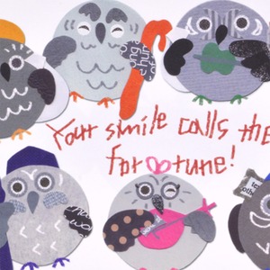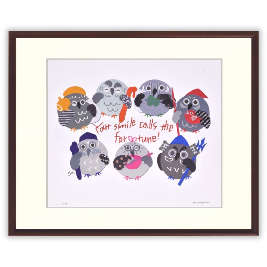 七福神に見立てたふくろうたちが仲良く並び、見る人に幸福を届けてくれるようなユーモラスな一枚です。異なる装いをした七羽の表情はどれも愛らしく、思わず笑みを誘います。紙の切り絵ならではの異素材の組み合わせや風合いが活かされ、温もりと遊び心あふれる雰囲気が魅力です。縁起の良さと軽やかなデザインが合わさり、日常に彩りを添えてくれる作品です。