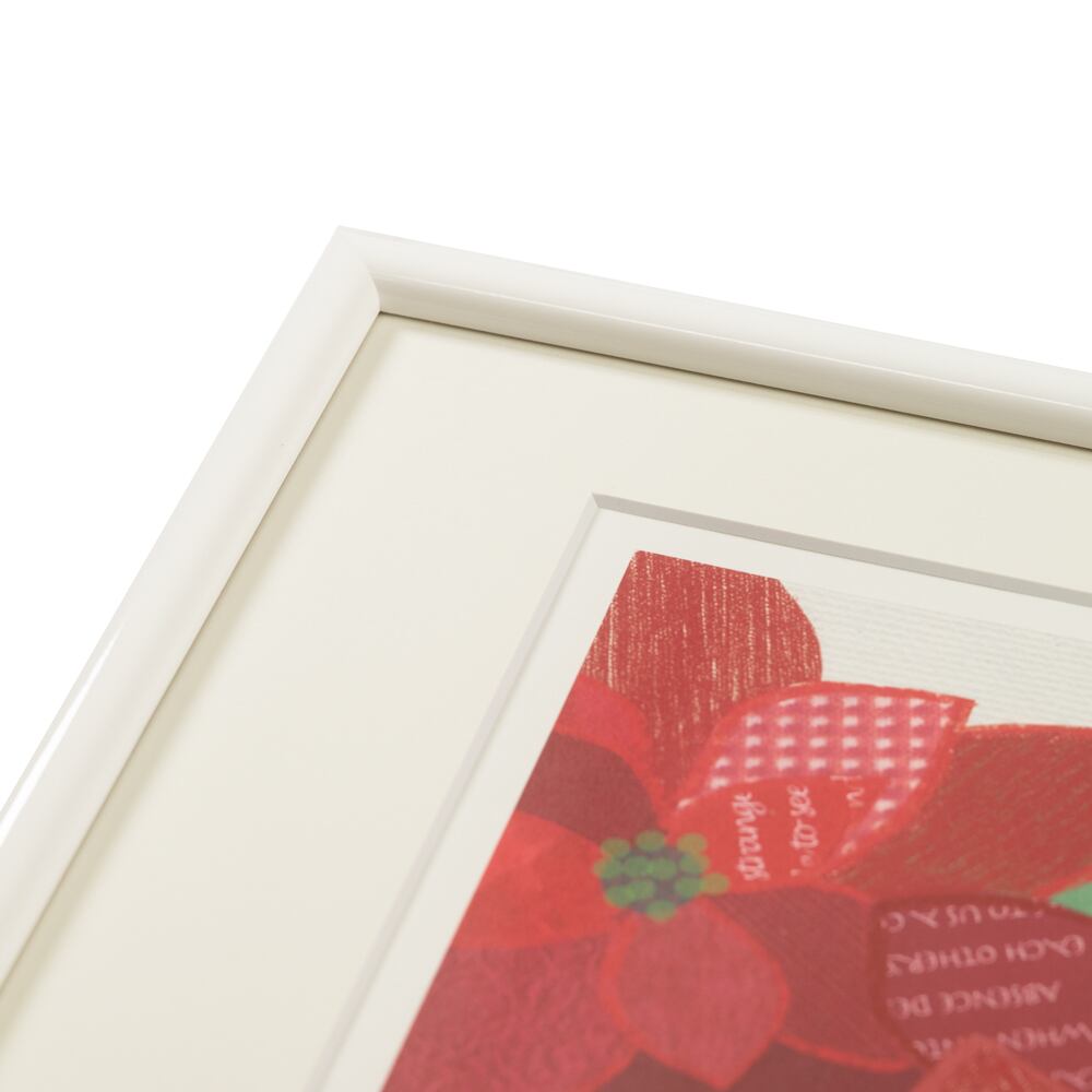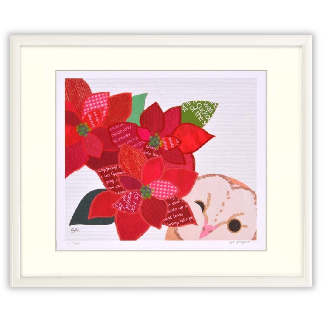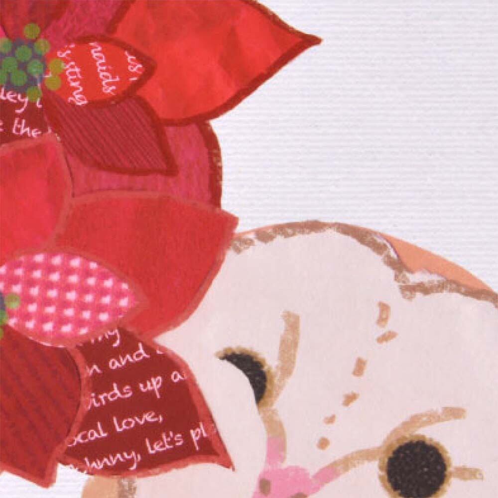 鮮やかな赤いポインセチアが画面いっぱいに咲き誇り、その陰から愛らしいメンフクロウがひょっこりと顔をのぞかせるユーモラスな作品です。切り絵ならではの重なりや紙の質感が花びらの立体感を際立たせ、冬の華やかな空気を感じさせます。深い赤と緑のコントラストが印象的で、そこに添えられたフクロウの柔らかな表情が心を和ませます。季節感と温もりを同時に届けてくれる、眺めるたびに笑顔を誘う一枚です。