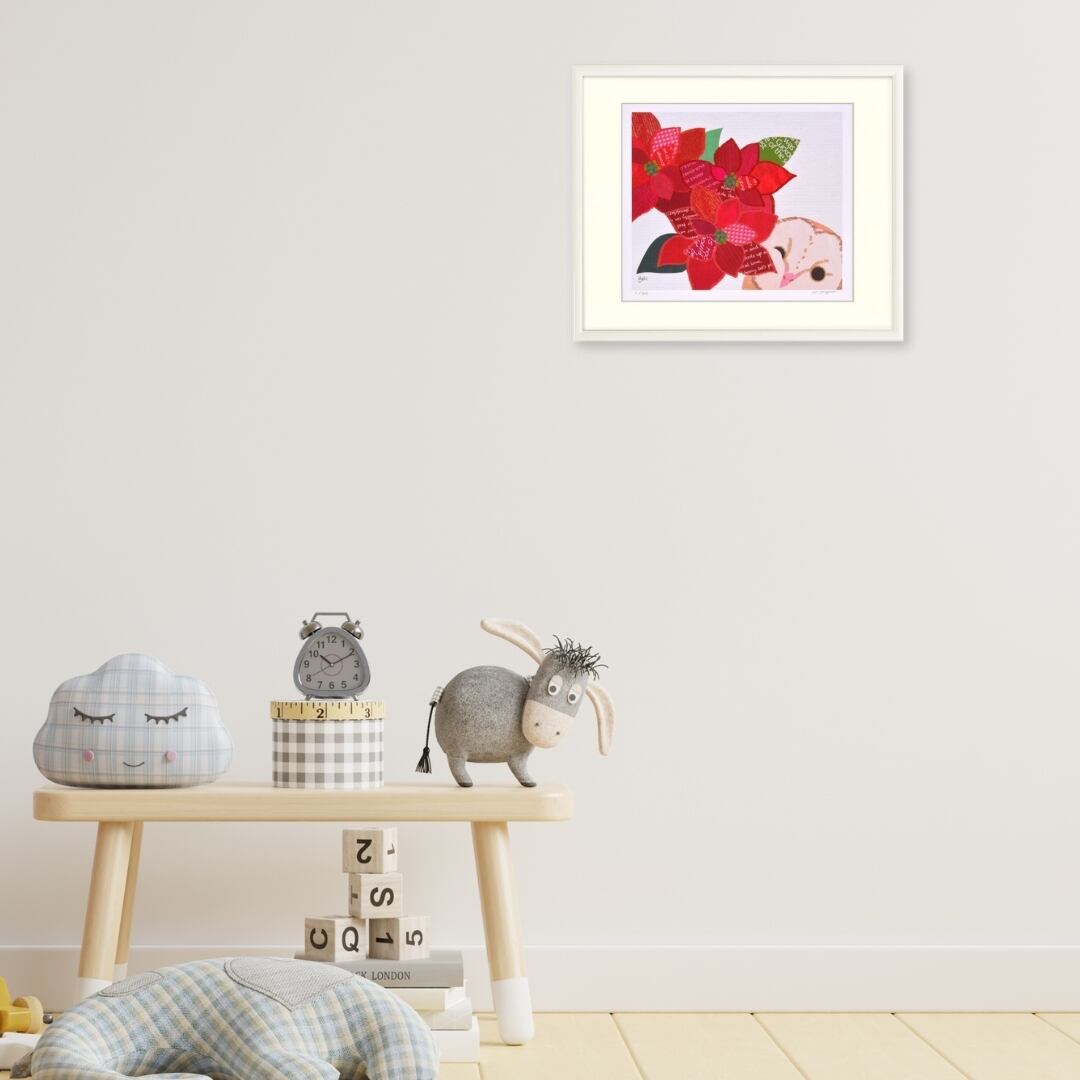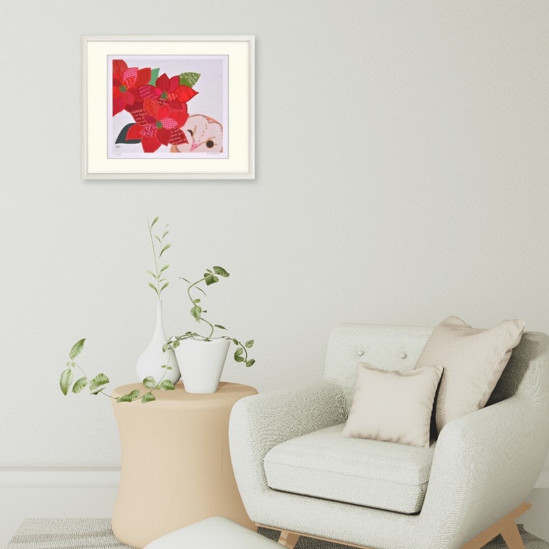 鮮やかな色彩のアートをインテリアに取り入れることで、室内を華やかに彩り、特別な季節感を演出します。この作品は花の存在感とフクロウの愛らしさが組み合わさり、リビングや玄関に明るく温かな雰囲気をもたらします。額入りアートとして完成しているため、手軽に壁に飾ることができ、空間を一瞬で華やかに変えてくれるのも魅力です。インテリアアートとしても贈り物としてもおすすめの一枚です。
