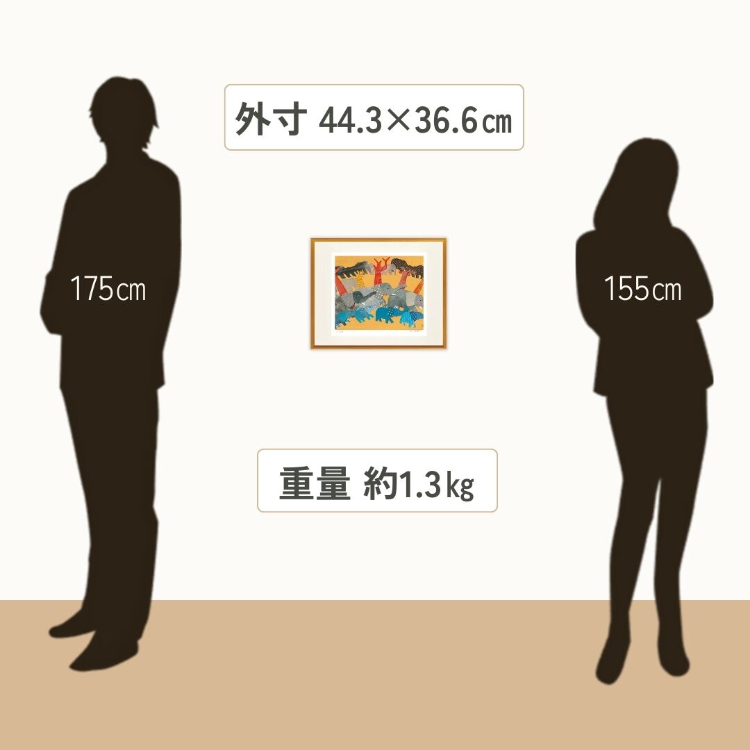 リビングや子ども部屋に飾れば、ゾウたちの行進が空間に元気とあたたかさを添えてくれます。群れで進む姿は家族のつながりや調和を思わせ、眺めるたびに安心感を与えてくれるでしょう。鮮やかな色彩とリズム感のある構成は、お部屋の雰囲気をいきいきと輝かせます。インテリアアートとして取り入れれば、日常の中に自然とアートを楽しむ喜びを加えることができます。