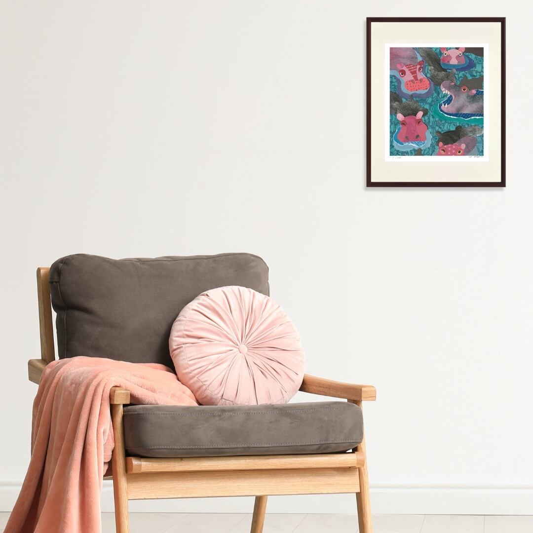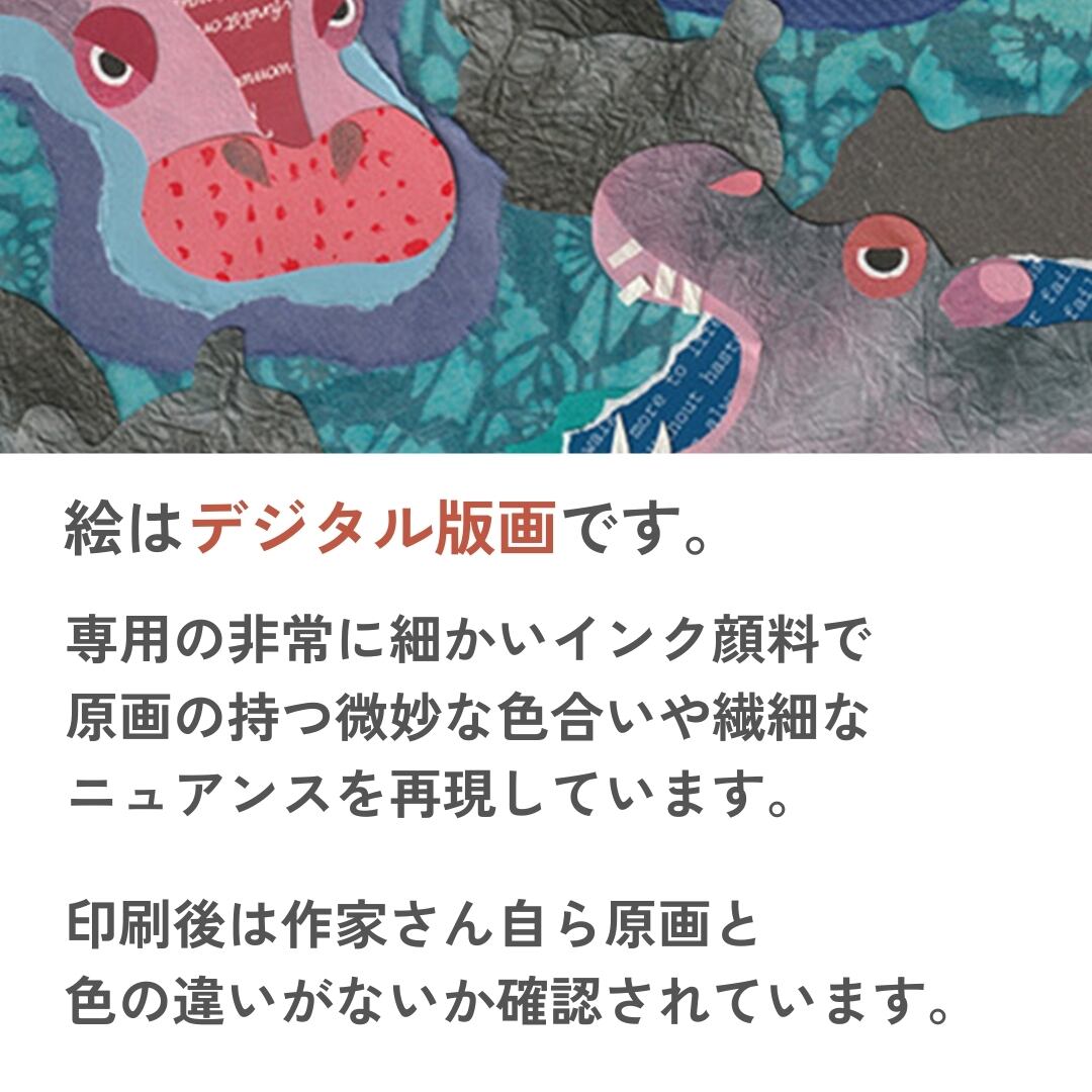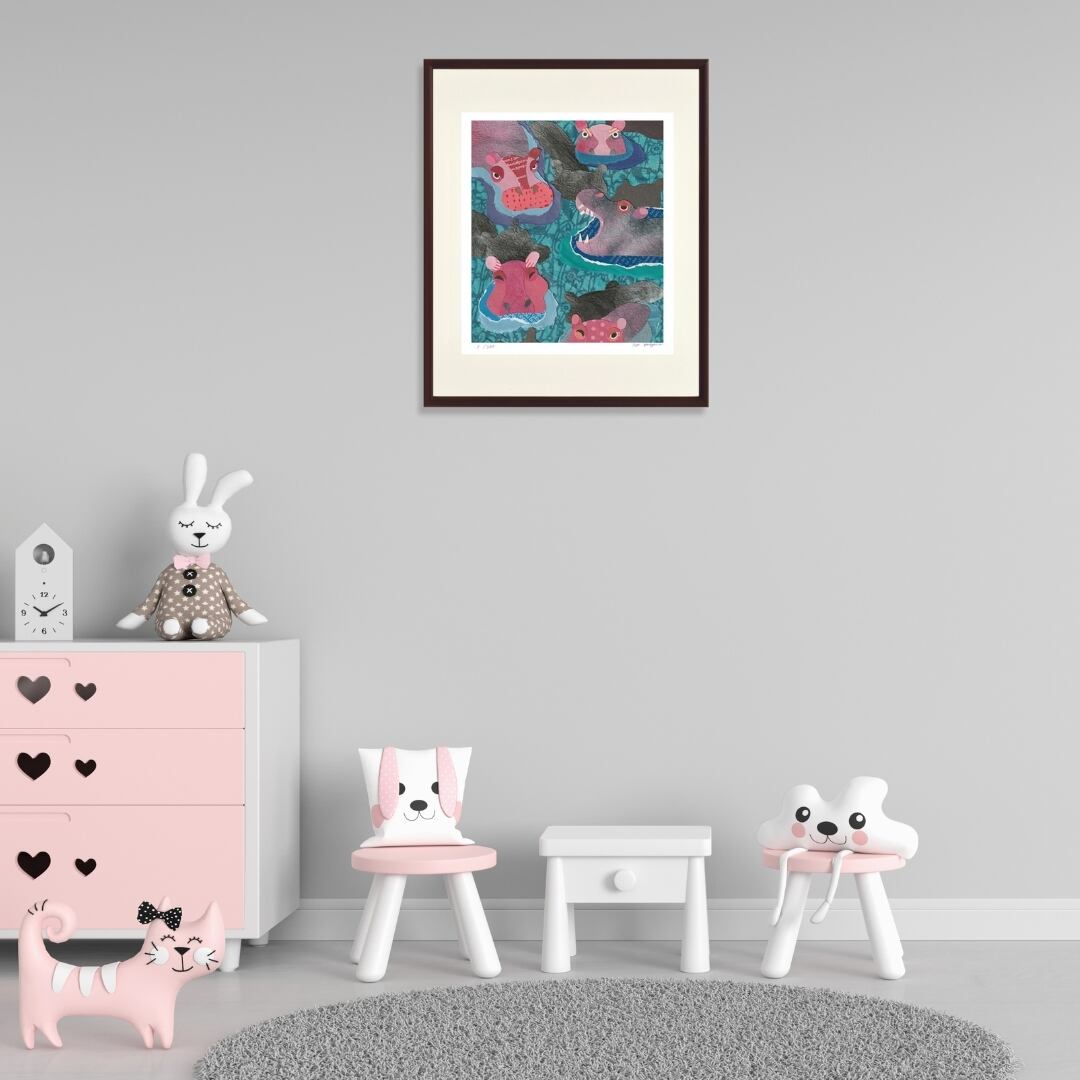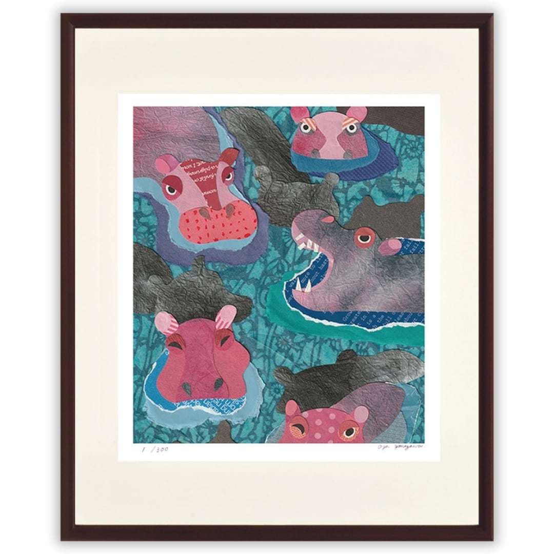 本作をお部屋に飾ると、空間に自然と明るさと親しみやすさが生まれます。愛嬌のあるカバたちの姿は、眺めるたびに笑みを誘い、リビングやダイニングなど人が集う場所を和やかに彩ってくれるでしょう。遊び心にあふれた表情は来客との会話のきっかけにもなり、日常に楽しさを添えてくれます。額入りアートとして飾れば、カジュアルでありながらも品のある雰囲気を演出でき、インテリアアートとして空間に心地よいアクセントを与えます。暮らしの中でアートを楽しむ喜びを感じさせる、存在感豊かな一枚です。
