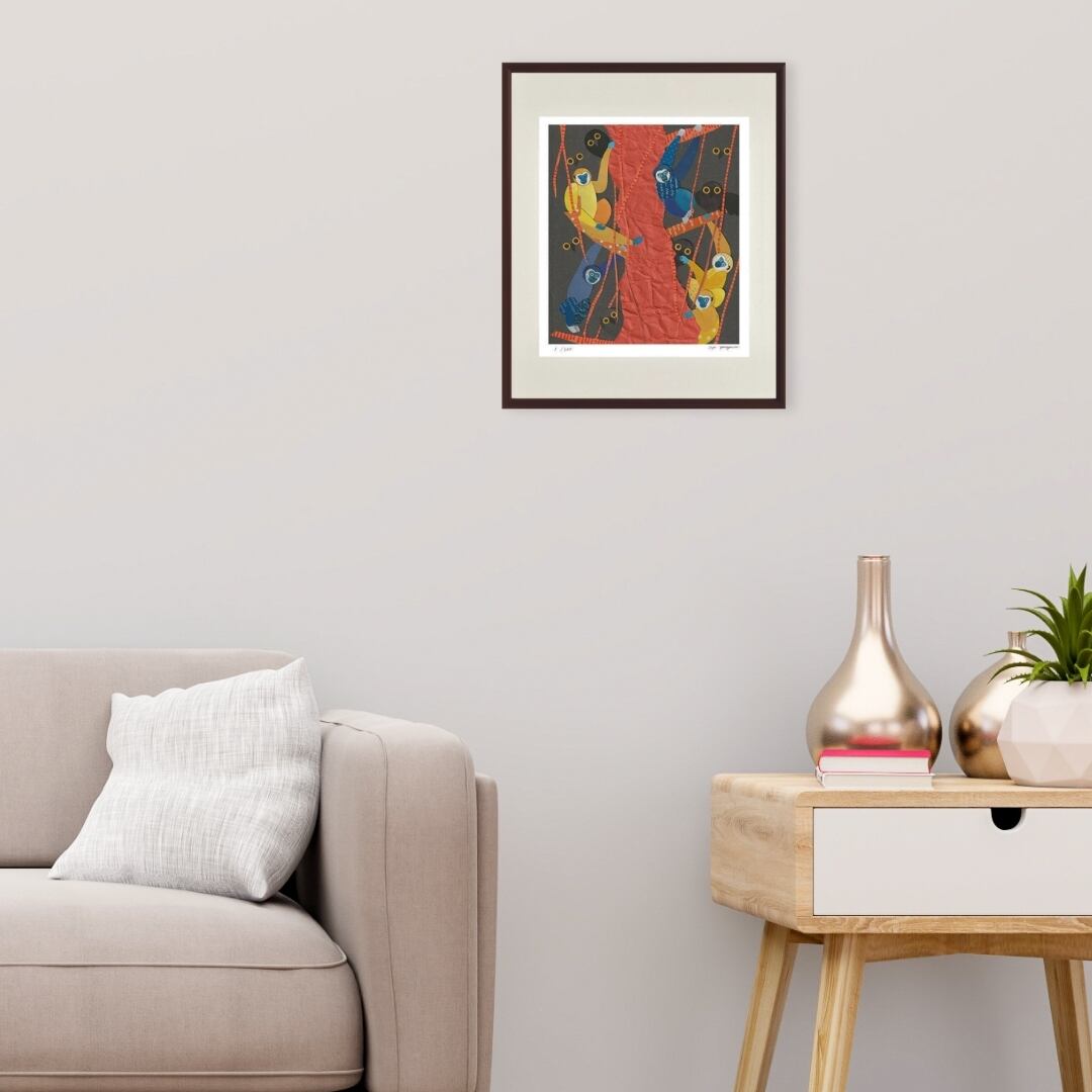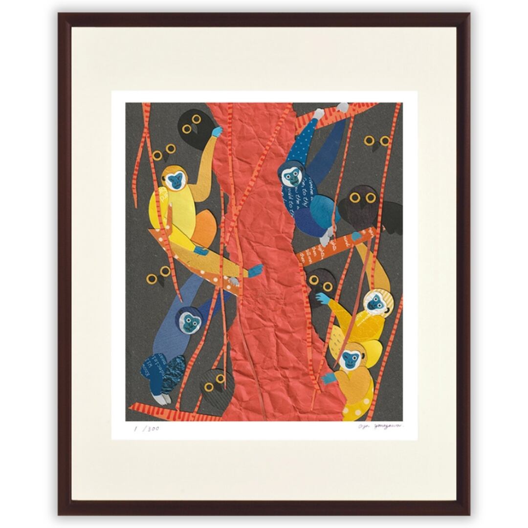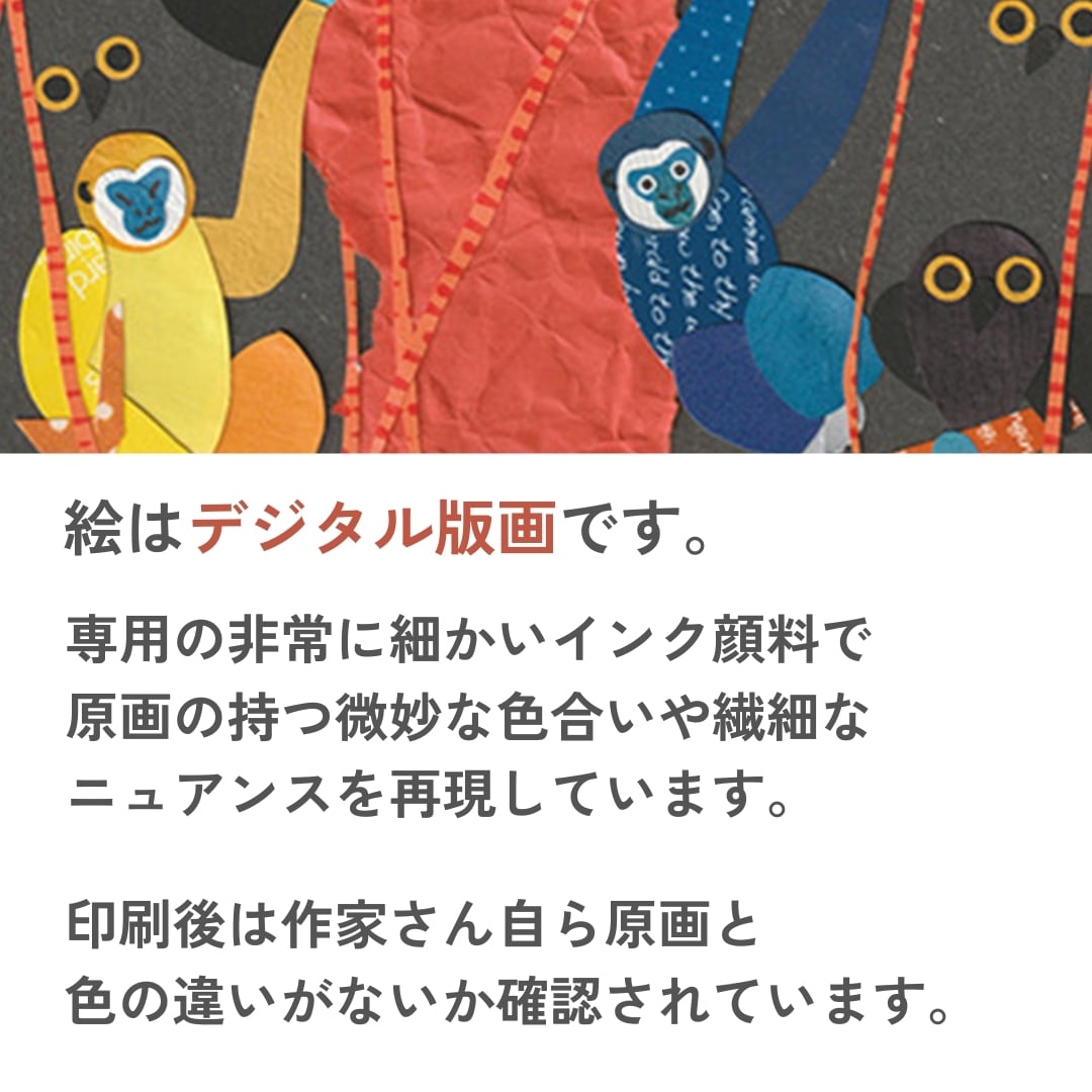 この作品をお部屋に飾ると、空間全体に生き生きとしたリズムが生まれます。サルたちの軽快な動きや楽しげな雰囲気は、見るたびに気持ちを明るくし、日常に元気を与えてくれる存在となるでしょう。リビングや子供部屋など活気を求める空間に特におすすめで、会話を弾ませる効果も期待できます。額入りアートとして飾れば、カジュアルながらも洗練された雰囲気を演出でき、インテリアアートとしても高い魅力を発揮します。暮らしの中にアートを取り入れることで、毎日に自然な彩りと楽しさをプラスしてくれる一枚です。