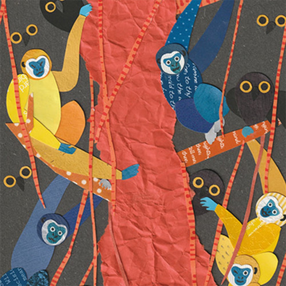 元気いっぱいのサルたちが枝から枝へと飛び移り、活発に動き回る様子を切り絵で表現した作品です。色鮮やかなイエローやブルーの体が躍動感を生み出し、背景の深い色調とのコントラストがサルたちの生命力を際立たせています。紙の質感を巧みに活かした表現は、動物たちの毛並みや表情に豊かなニュアンスを与え、まるで森の中の賑やかな時間をそのまま切り取ったかのような世界観をつくり上げています。愉快でありながらも力強さを感じさせる構図は、自然界のエネルギーを身近に感じさせ、眺める人に活気を与えてくれるでしょう。