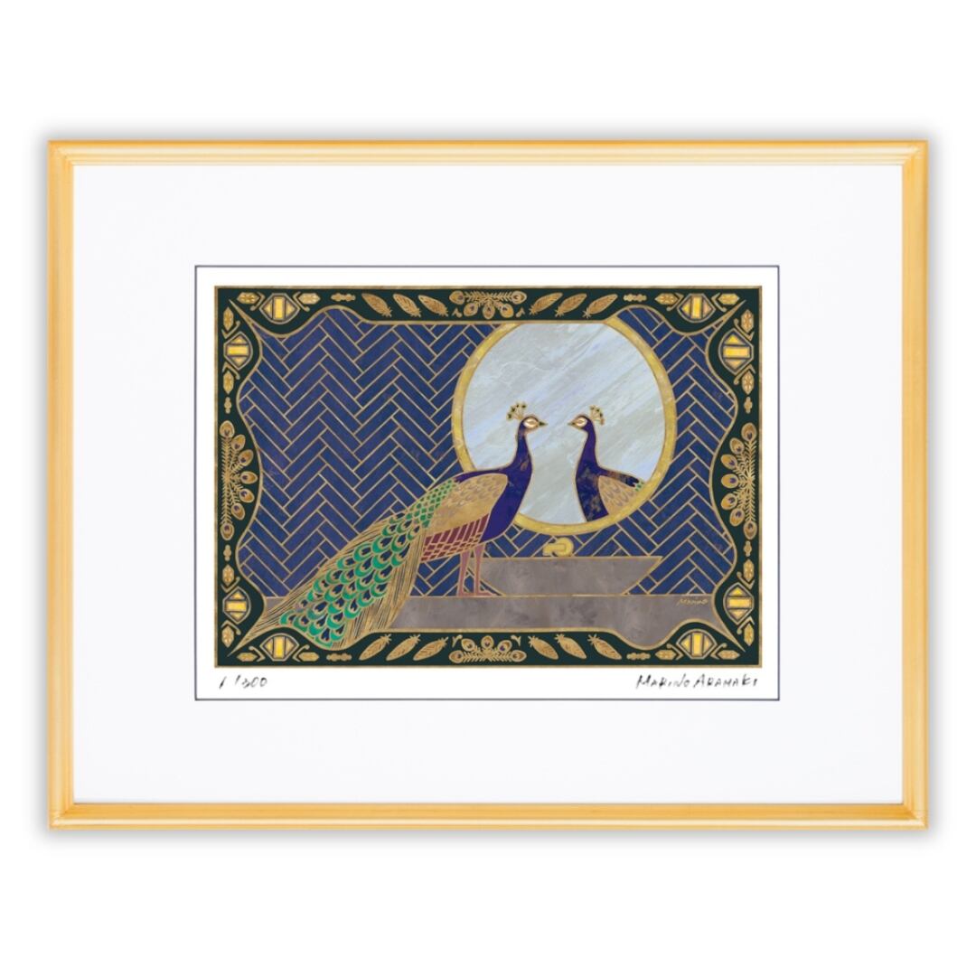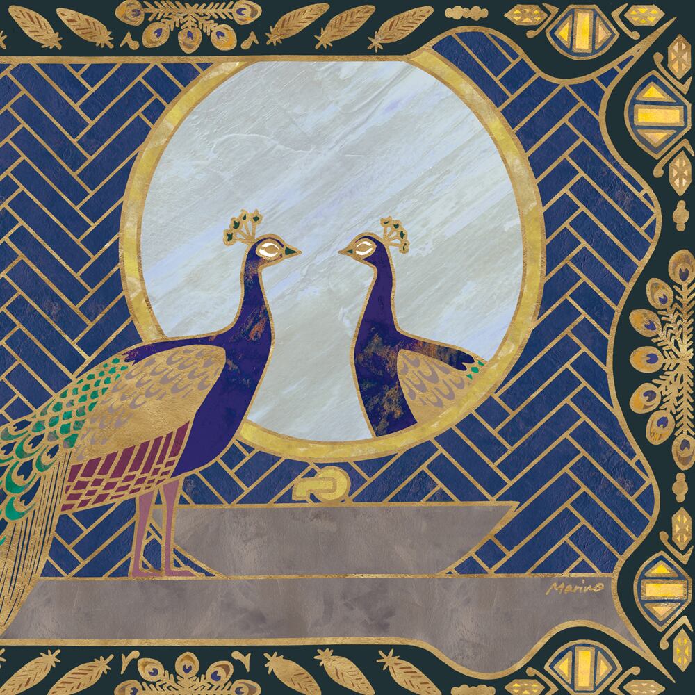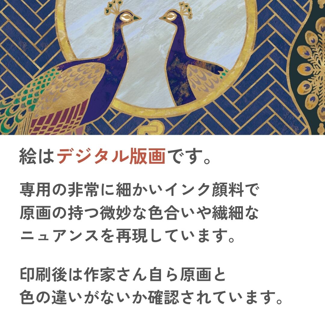 金と群青が織りなす気品あふれるインテリアアート。鏡の前に佇む2羽の孔雀が、まるでお互いの美しさを讃え合うように描かれています。繊細な羽の模様と深いブルーの背景が織りなすコントラストは、静けさの中に高貴な気配を漂わせます。アール・デコ調の幾何学的な装飾が構図全体を引き締め、洗練された印象を与えるのも魅力。イラストでありながら、まるで金箔細工のような立体感を感じさせるアート作品です。優美で落ち着いた空気感が、見る人の心を穏やかに包み込みます。