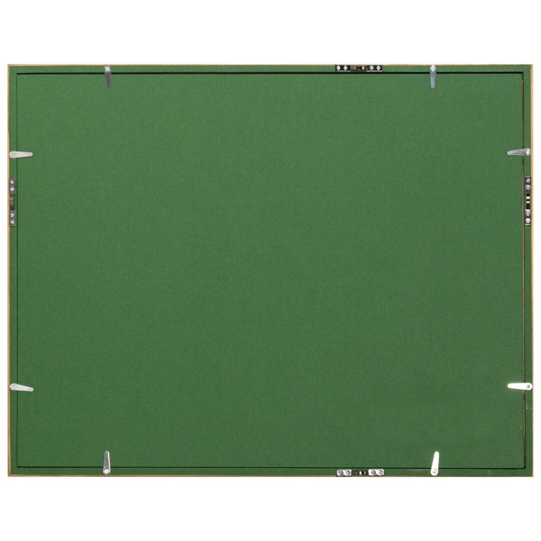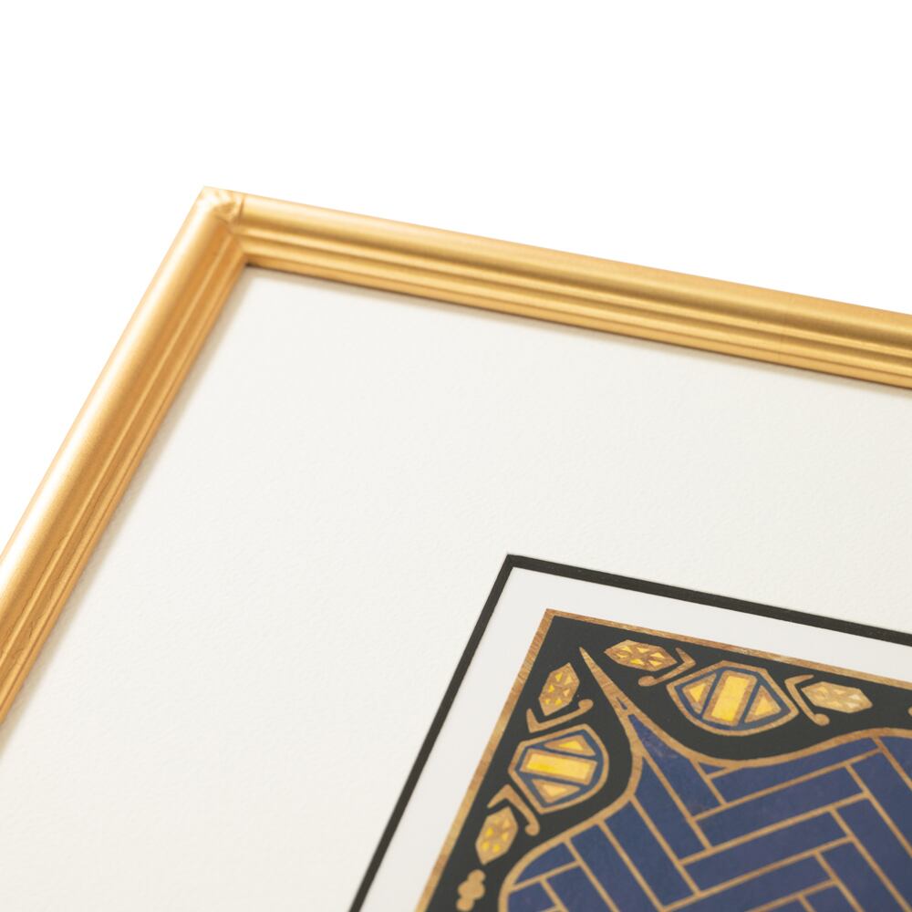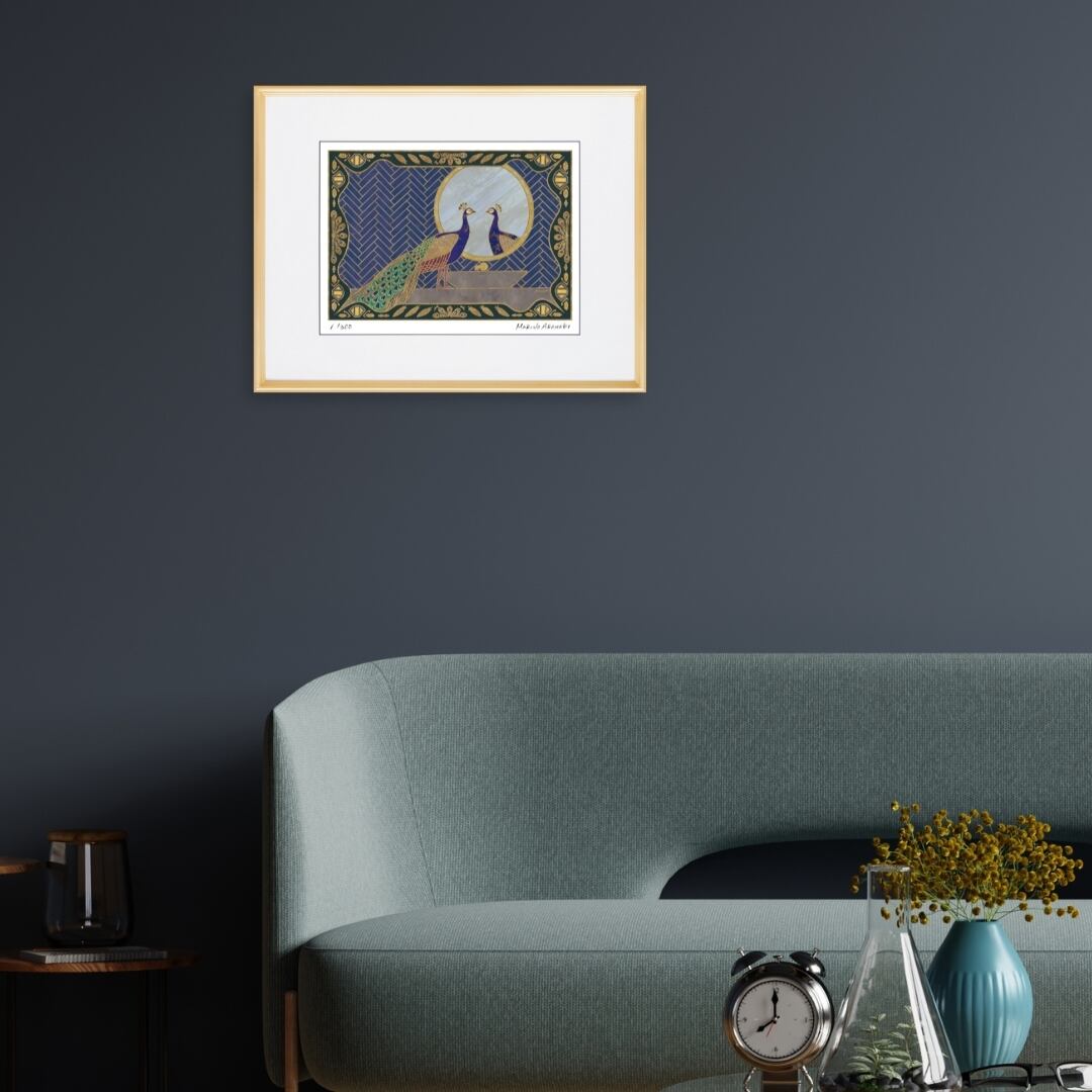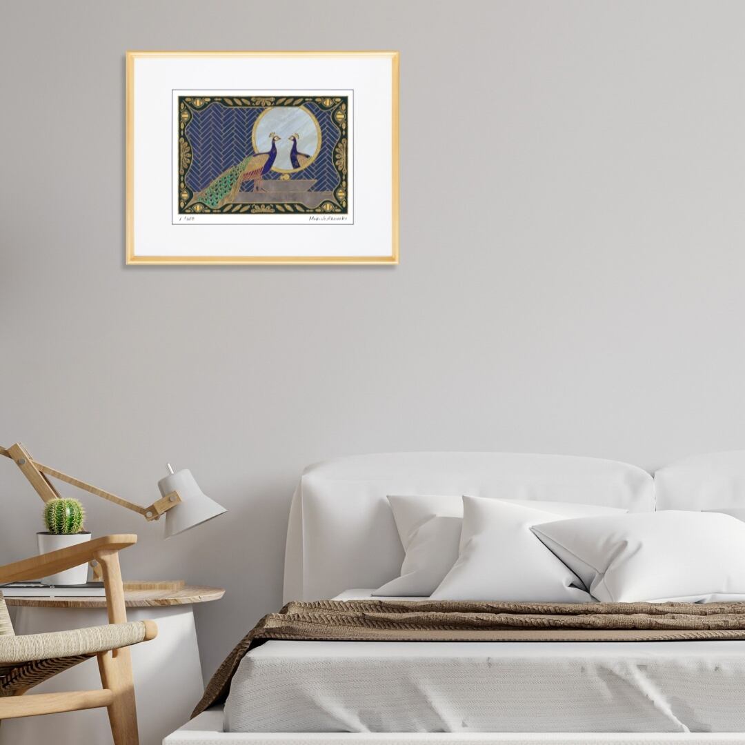 金と群青が織りなす気品あふれるインテリアアート。鏡の前に佇む2羽の孔雀が、まるでお互いの美しさを讃え合うように描かれています。繊細な羽の模様と深いブルーの背景が織りなすコントラストは、静けさの中に高貴な気配を漂わせます。アール・デコ調の幾何学的な装飾が構図全体を引き締め、洗練された印象を与えるのも魅力。イラストでありながら、まるで金箔細工のような立体感を感じさせるアート作品です。優美で落ち着いた空気感が、見る人の心を穏やかに包み込みます。