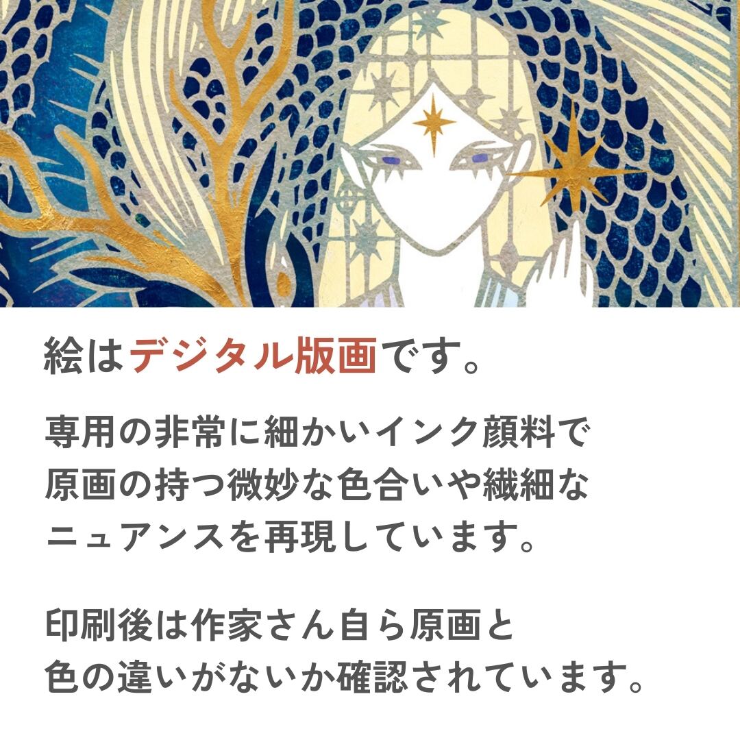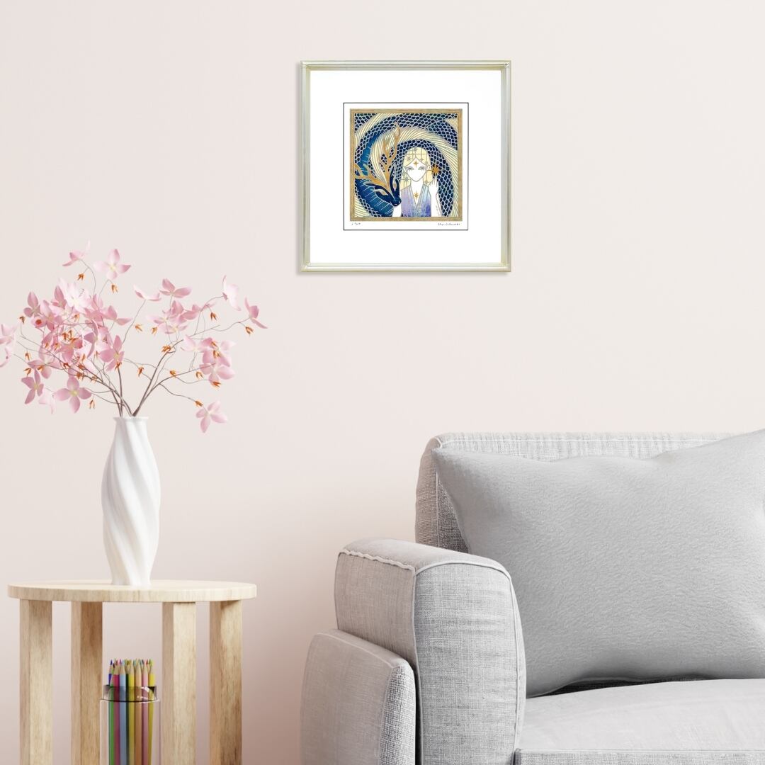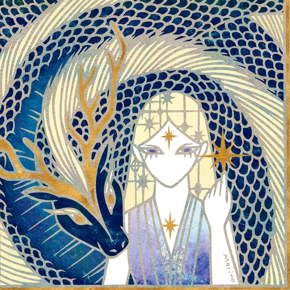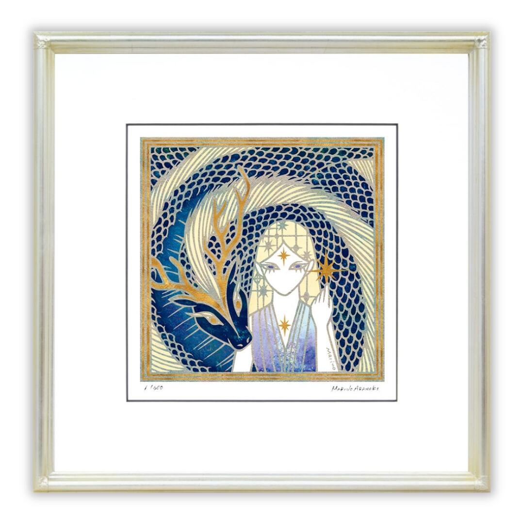 神秘的な青と金の世界の中、静かに佇む女性と龍が描かれた印象的なインテリアアート。流れるような曲線と細やかな鱗模様が、龍の力強さと優雅さを美しく表現しています。女性の柔らかな表情と金色の星のモチーフが調和し、神話の一場面を切り取ったような幻想的な雰囲気を漂わせます。イラストとしての繊細さと、アート作品としての深い精神性が融合した一枚。見る人に静かな力と安らぎを与える、まさに「守護」の象徴のような存在感を放つ作品です。