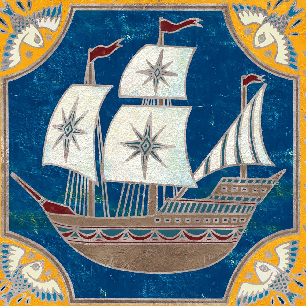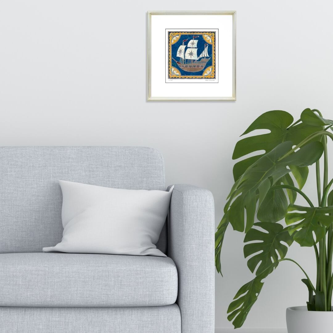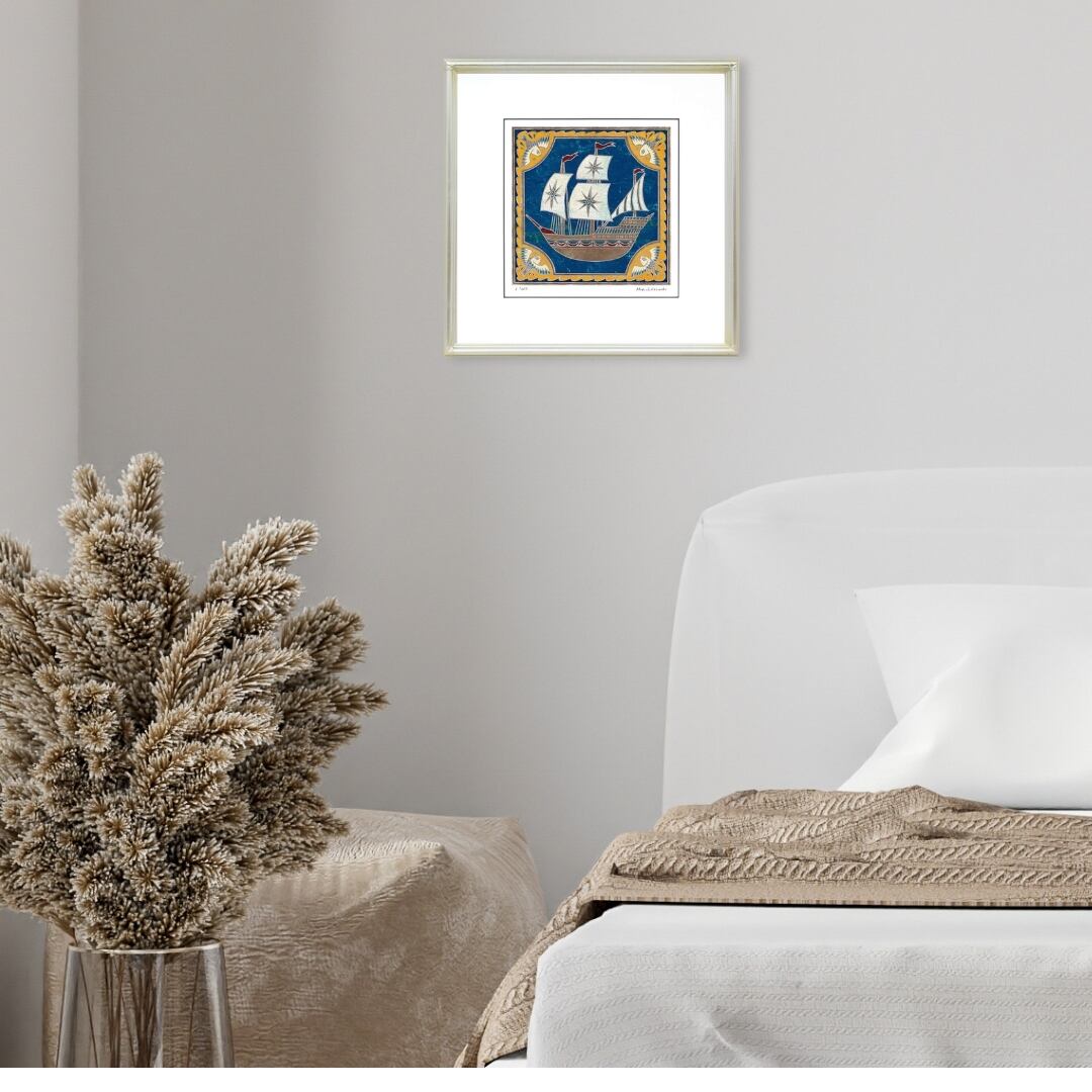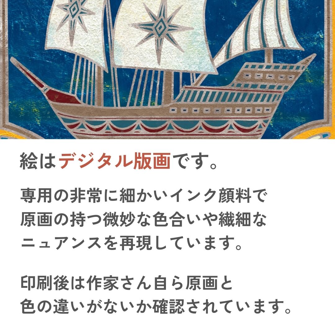 青い海原を進む帆船が描かれた、生命力あふれるインテリアアート。大きく広がる白い帆には星のモチーフが輝き、未来への希望と冒険の始まりを感じさせます。細部まで丁寧に施された金の装飾と、重厚な色合いのコントラストが、クラシカルでありながらも新鮮な印象を与える作品です。イラストとしての親しみやすさと、アートとしての格式を兼ね備えた美しい構図。見ているだけで心が前向きになり、新しい一歩を踏み出す勇気を与えてくれるような一枚です。