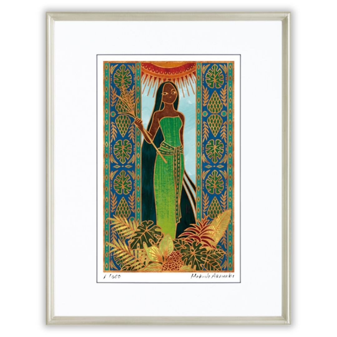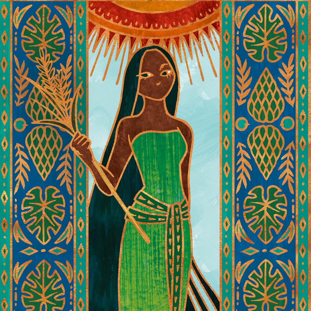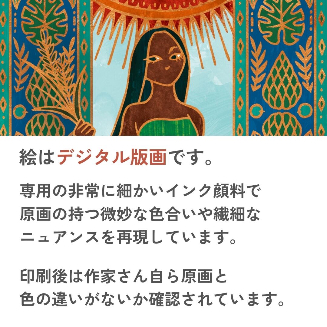 鮮やかな緑と金色が調和した、生命感あふれるインテリアアート。夏の太陽を背に、南国の風を感じさせる女性が描かれています。背景に広がる植物文様や装飾的なデザインは、自然と豊かさの象徴。女性の穏やかな表情と堂々とした佇まいが、力強さと優雅さを同時に表現しています。イラストとしての柔らかさと、アート作品としての重厚さが見事に融合した一枚。夏の情熱と自然の恵みを感じさせるデザインで、空間を明るくエネルギッシュに彩ります。
