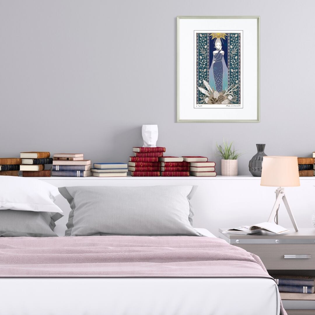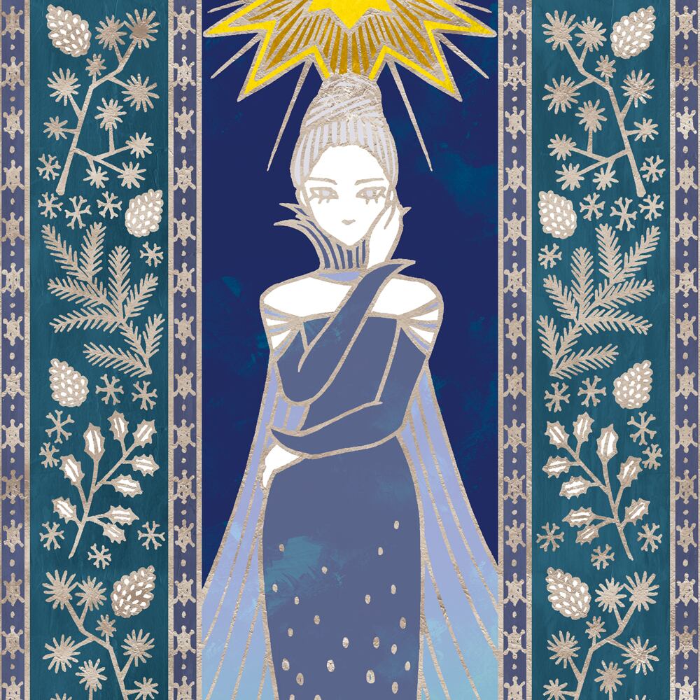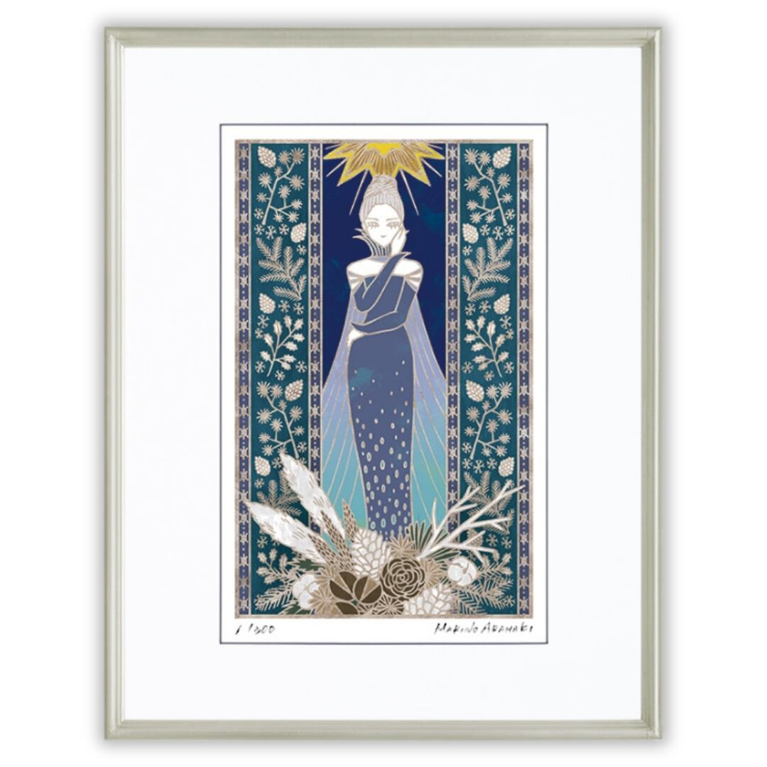澄みきった冬の空気を思わせる、深いブルーとシルバーの輝きが美しいインテリアアート。静かに立つ女性は、冬の女神のような気品と凛とした美しさを湛えています。背景に描かれた雪のような花々や植物文様が、冷たい空気の中に潜む生命の輝きを表現。上部の金色の光が希望の象徴となり、全体を優しく包み込みます。イラストの繊細な線とアートとしての構図の美しさが融合した一枚で、静寂と光、強さと優しさが共存する冬の物語を感じさせます。