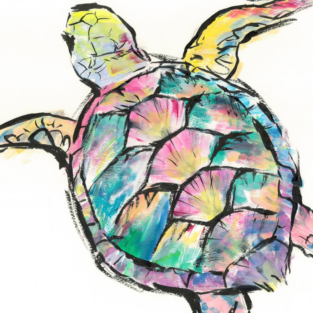 カラフルな甲羅と伸びやかな姿が印象的なカメを描いたイラストです。ピンクやブルー、グリーンなど鮮やかな色彩が水彩のように重なり合い、生命力あふれる存在感を放っています。黒い力強い輪郭線が全体を引き締め、エネルギッシュでありながら優雅さも感じさせるアート作品です。どこか自由に泳ぐカメの姿が、見る人に安らぎと前向きな気持ちを届けます。個性豊かな色彩表現とダイナミックな構図が魅力のインテリアアートです。