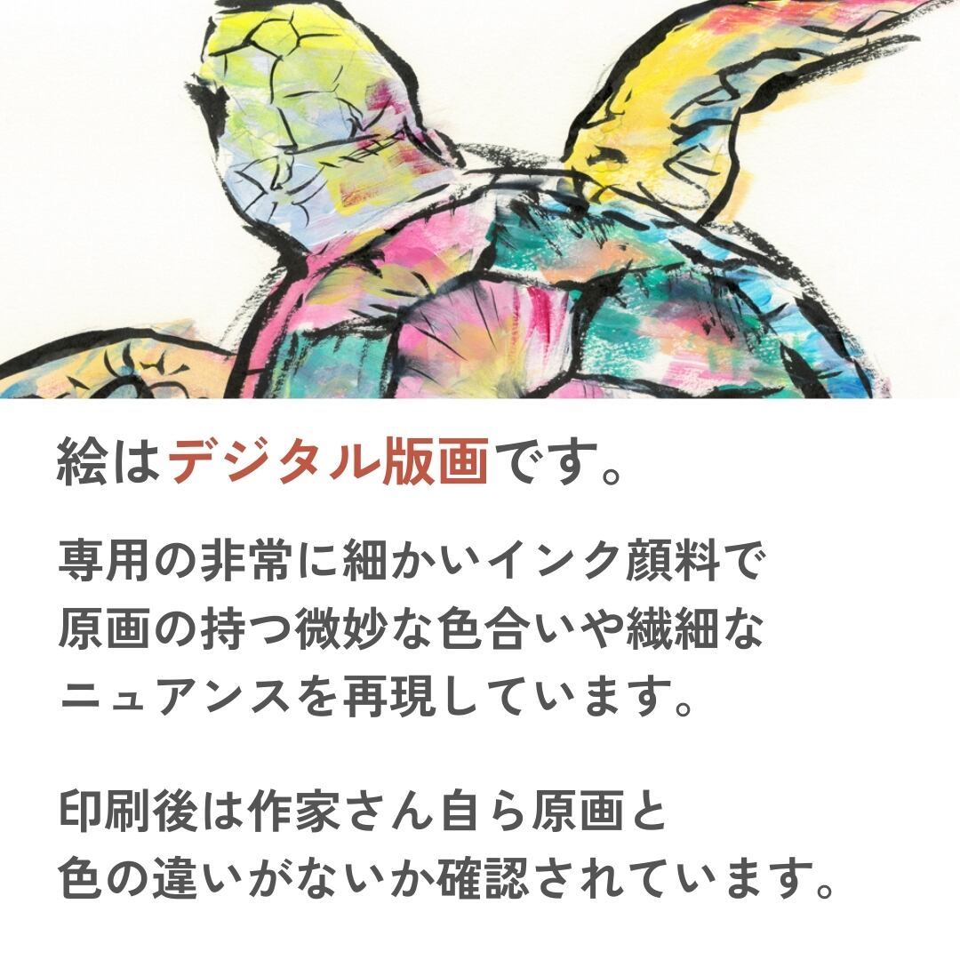 この額縁付きイラストをお部屋に飾れば、鮮やかな色彩が空間を一気に明るく華やかにしてくれます。カメは「長寿」「幸運」を象徴するモチーフとしても親しまれており、インテリアに取り入れることでポジティブなエネルギーを感じられます。リビングや玄関、ワークスペースなど、日常に彩りを添えるアクセントとして最適。アートとしての存在感が強く、額縁付きですぐに飾れるため、空間をスタイリッシュに演出するインテリアアートです。