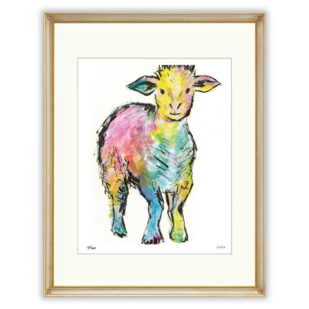 柔らかな表情の子羊を描いたイラストは、ピンクやブルー、イエローなどの鮮やかな色彩が重なり合い、温かみと優しさを感じさせます。黒のアウトラインが全体を引き締め、カラフルでありながら調和のとれた印象を与えています。子羊特有の無垢な眼差しと丸みを帯びた姿は、見る人に安らぎを届ける存在感を放っています。シンプルでありながら華やかさを持ち合わせたこのアートは、心を和ませるインテリアアートとして最適な作品です。