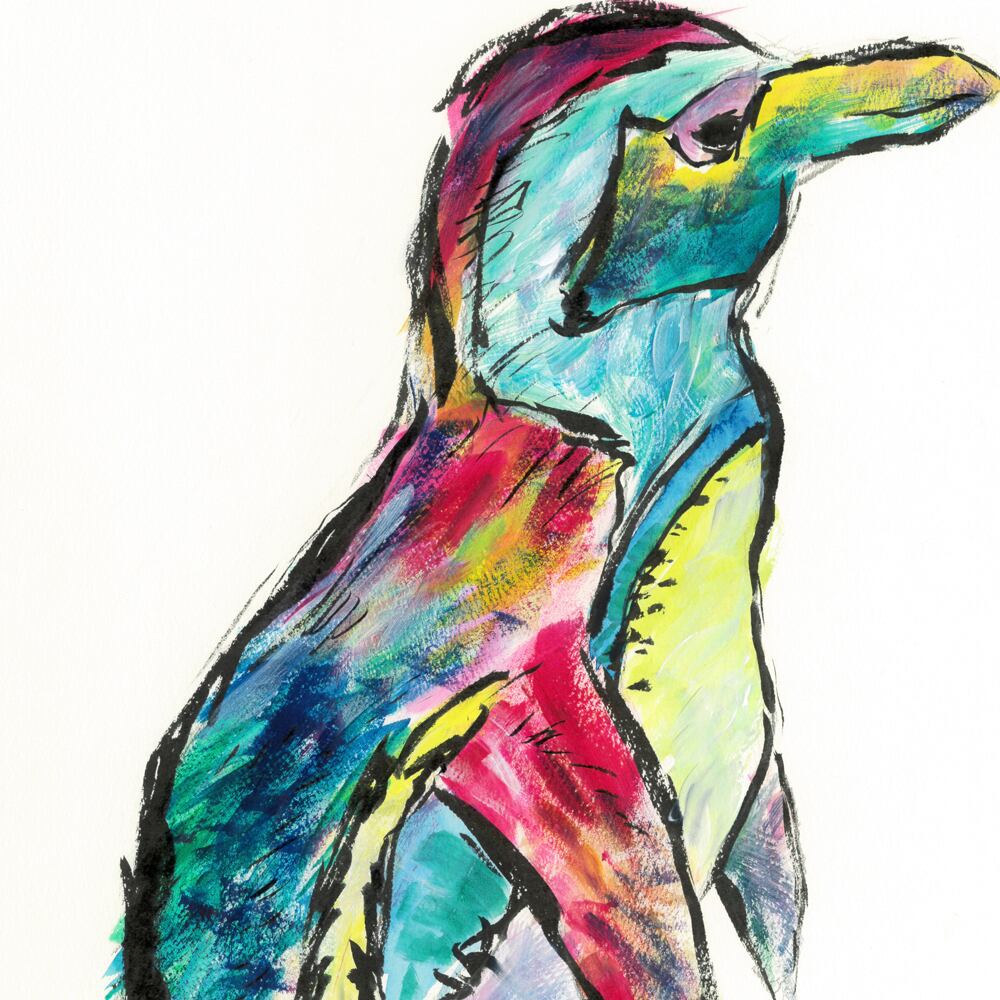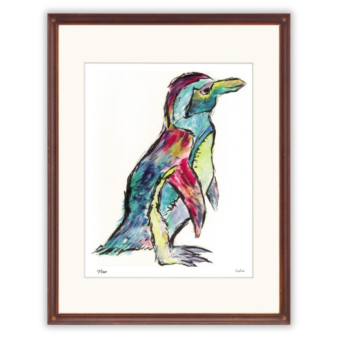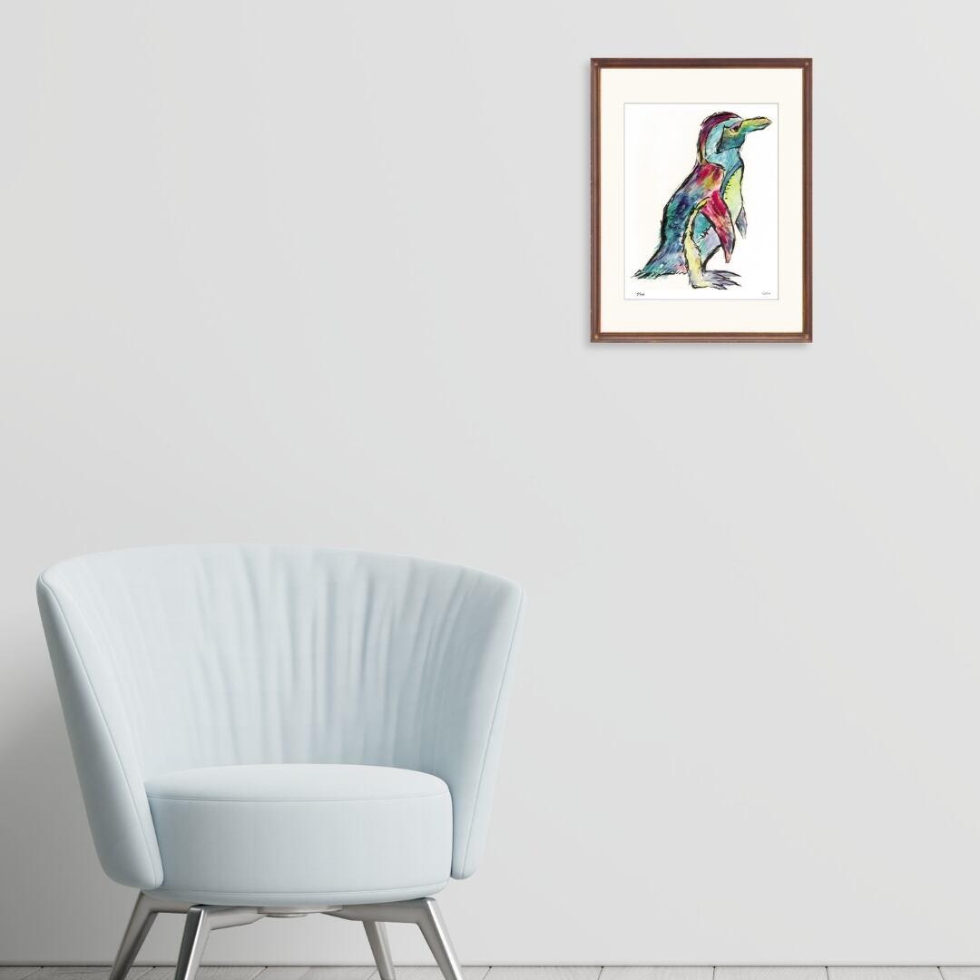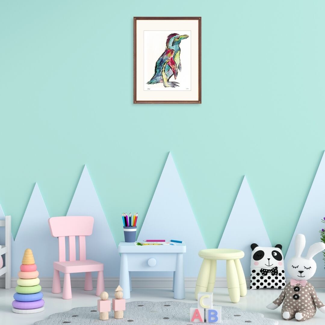 立ち姿のペンギンを描いたイラストは、ブルーやレッド、イエローなど多彩な色彩が重なり合い、独特の存在感を放っています。黒の輪郭線がシルエットを強調し、可愛らしさの中に力強さも感じられるアート作品です。羽の質感や立ち姿のバランスが巧みに表現され、シンプルながら印象的な構図に仕上がっています。愛らしい動物の魅力とカラフルな彩色の融合が、見る人に楽しさと癒しを与えるインテリアアートです。