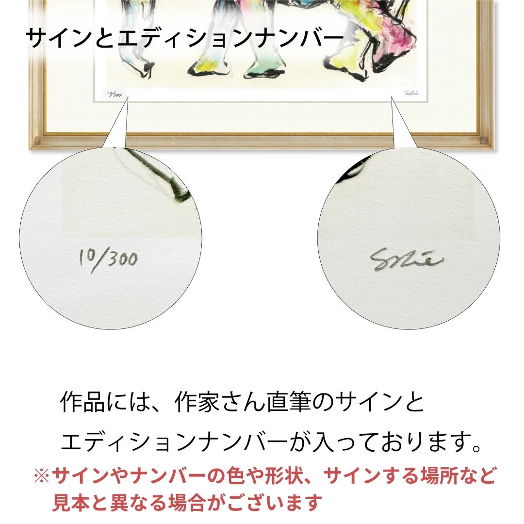 図柄ごとに作家のサイン、エディションナンバーつきの版画作品で数量限定販売になっています。