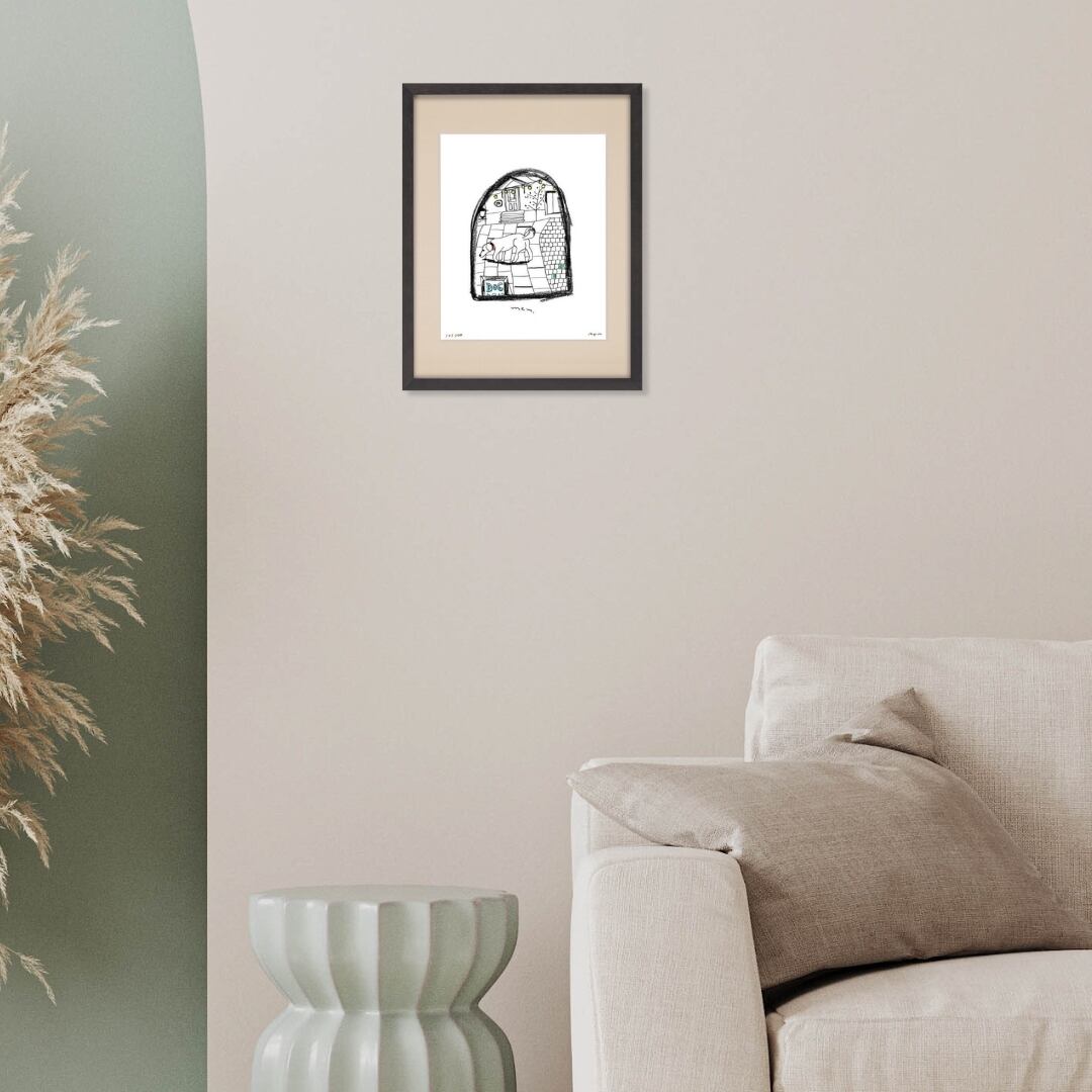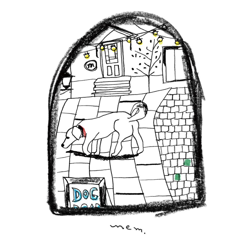 やわらかな鉛筆の線で描かれた街角に、赤い首輪をつけた一匹の犬が静かに歩いています。抑えられたモノトーンの中で、わずかな色の差し方がリズムを生み、見る人の想像を自然と誘います。丸みを帯びたアーチ状の構図は、まるで小さな物語を覗き見るようで、穏やかでありながらどこかノスタルジック。背景に吊るされた明かりが、静かな夜のぬくもりを感じさせます。シンプルな線と余白のバランスが絶妙で、見るたびに新しい静けさが心に広がる作品です。