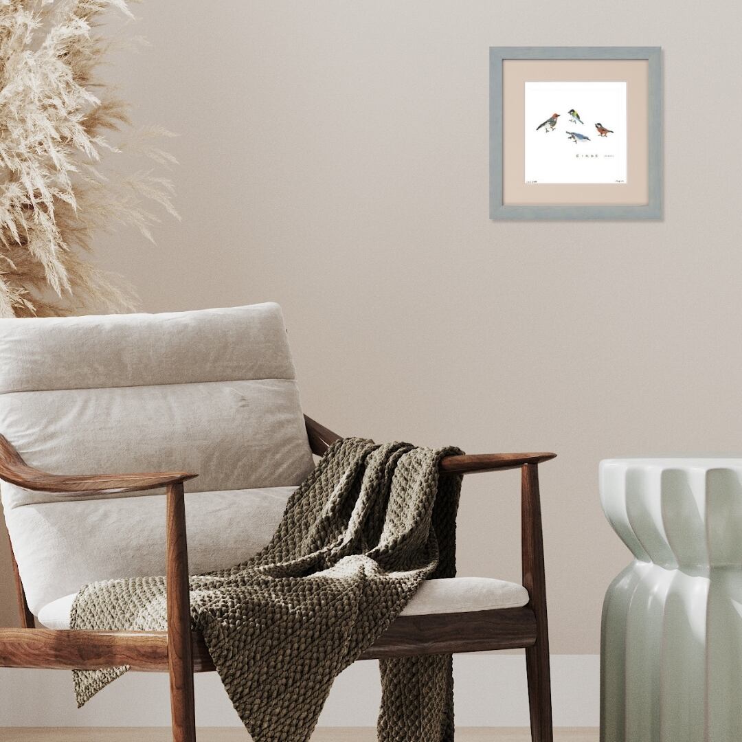 白を基調とした余白の美しさが、インテリア空間に軽やかな呼吸を生み出します。ナチュラルインテリアやモダンな空間にも溶け込み、壁掛けアートとして静かな彩りを添えます。小鳥たちの穏やかな佇まいは、見る人の心をやさしく解きほぐし、日々の暮らしに安らぎと明るさを運びます。額付きアートとして仕立てられた作品は、自然のぬくもりをそのまま室内に迎え入れるような存在感を放ちます。