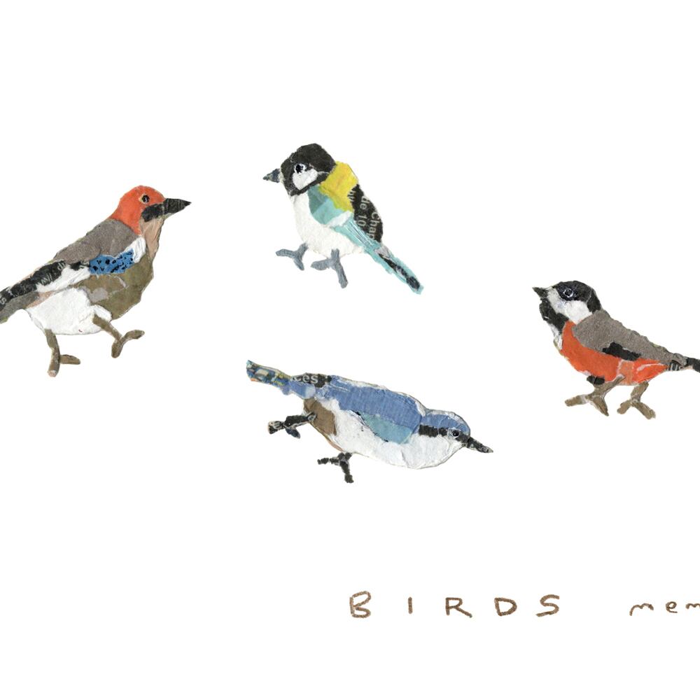 ちぎり絵で表現された4羽の小鳥たちは、それぞれ異なる色と形を持ちながら、絶妙なバランスで画面の中に調和しています。紙の繊維が残る柔らかな輪郭が、羽のふくらみや光を受けた質感を自然に表し、まるで囁くように生命感を伝えます。くちばしの角度や足の向きまで丁寧に構成され、鳥たちの静かな会話が聞こえてくるよう。限られた色数の中に温度とリズムを宿した、ちぎり絵ならではの繊細な表現が光る作品です。