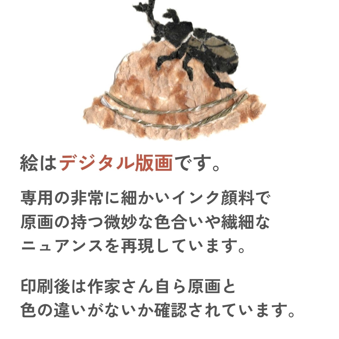 ちぎり絵で表現されたカブトムシは、小さな紙片の重なりから生まれる立体感と陰影によって、まるで本物のような生命力を放っています。光を受けて黒く輝く甲や、枝にしっかりと足をかける姿には、夏の自然の息づかいが感じられます。素材のやわらかさとモチーフの力強さが対照的に響き合い、どこか懐かしい記憶を呼び起こすような温もりが宿る一枚です。