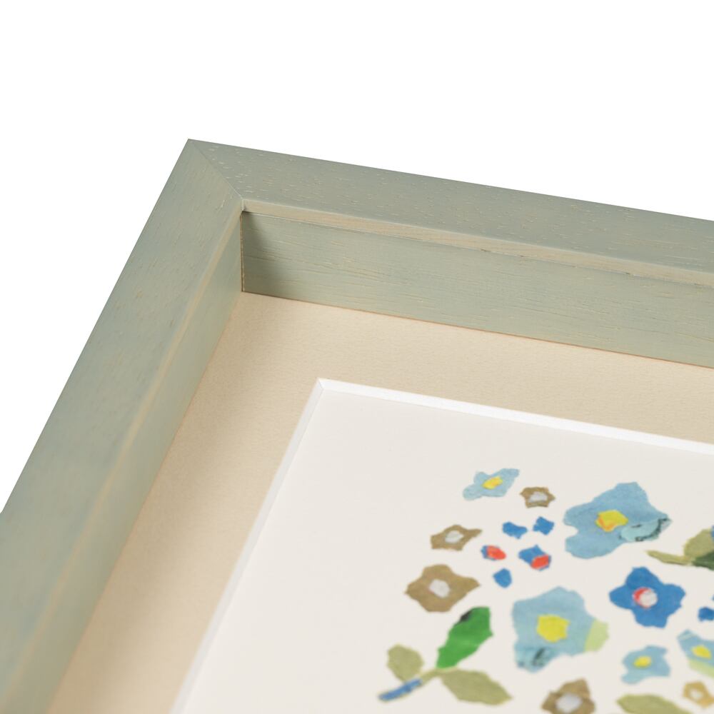 淡いブルーやグリーン、ほんのりと差し込む赤が調和した花々が、ちぎり絵の優しい質感で表現されています。