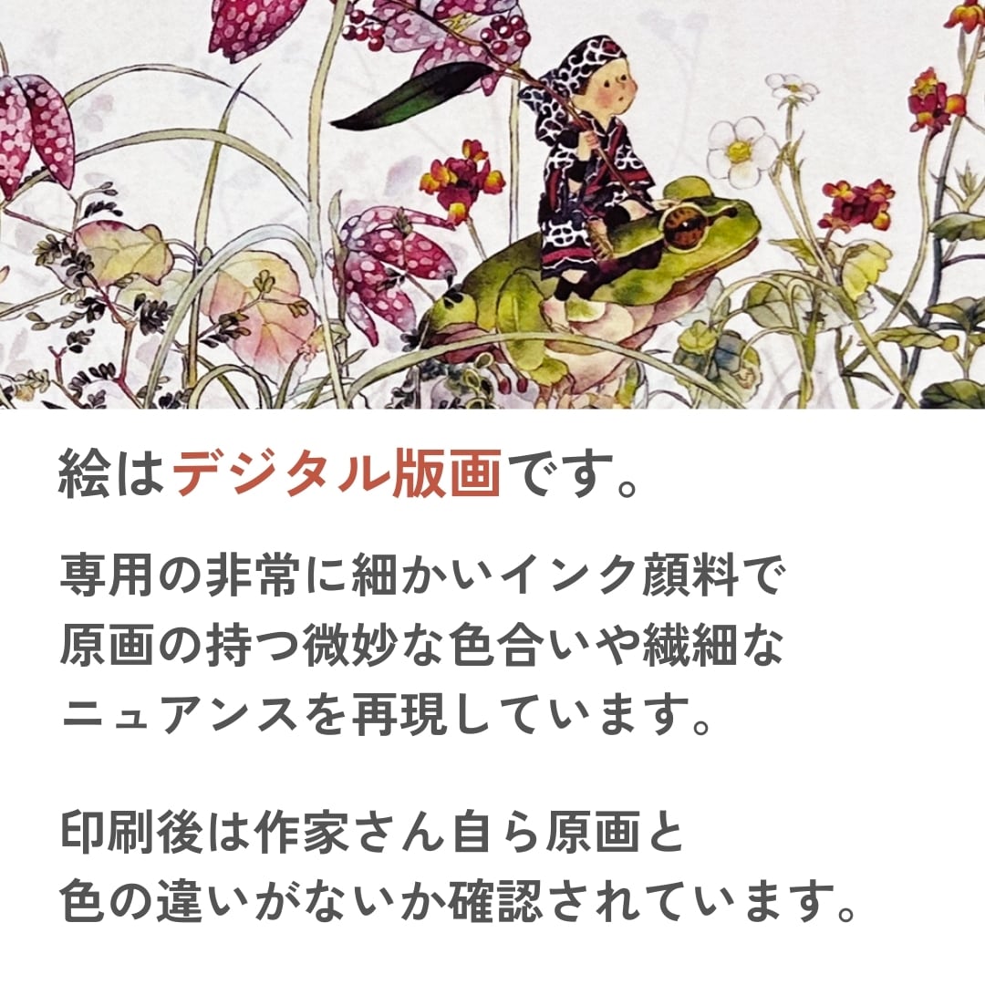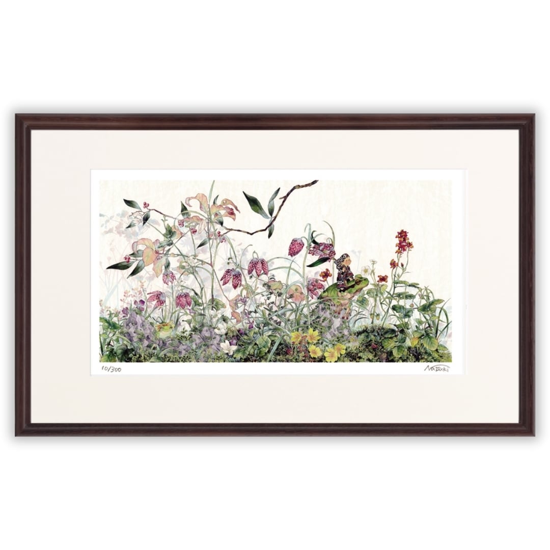草むらに咲く野の花や草木が繊細に描かれた作品です。透明水彩の柔らかな色合いと絵墨の落ち着いた線が調和し、どこか懐かしさを感じさせる和の世界が広がります。紫や赤の花が可憐に揺れ、緑の草々と混ざり合う様子は、まるで自然の一瞬を切り取ったよう。画面の右には小さな人物が描かれており、幻想的な物語性を漂わせています。細部まで丁寧に描かれた植物や表情豊かな色彩が、静けさと命の息吹を同時に感じさせ、眺める人の心をゆったりと和ませてくれるでしょう。