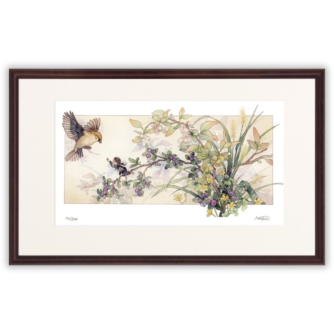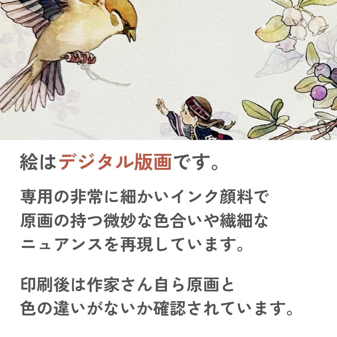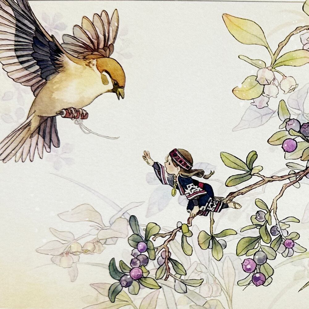 枝に実るコケモモと小さな花々が、透明水彩と絵墨のやわらかなタッチで描かれています。瑞々しい葉の緑と、紫や黄色の実や花の彩りが美しく調和し、自然の生命力を感じさせます。画面の中央には小さな人物が描かれ、枝に止まるようにして飛び交う小鳥と視線を交わす姿が、幻想的で物語性のある世界を広げています。淡い背景に浮かび上がるような構図は、静かな時間の流れと共に、懐かしさを呼び覚ますような和の趣を伝えてくれます。繊細な筆遣いが魅力的な、心和むアートです。