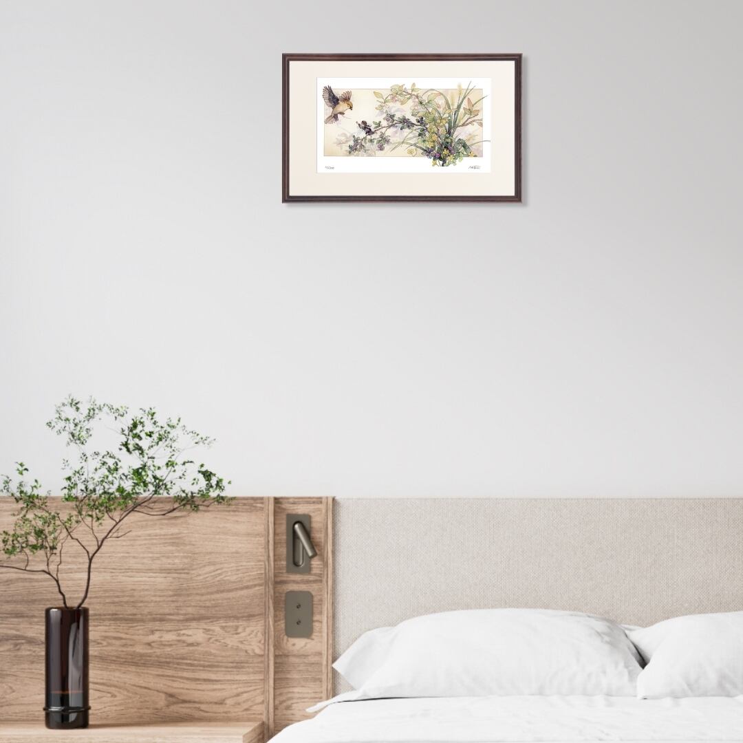 和のエッセンスを取り入れたこのアートは、飾る場所にやさしい調和をもたらします。自然の息吹を感じさせるコケモモの枝や小鳥の姿は、リビングや玄関に落ち着きを添え、四季の移ろいを感じさせるインテリアに仕上げてくれます。水彩の透明感と絵墨の繊細な線が、空間に温もりと上品さをプラスし、日常の中に心休まるひとときを生み出します。ナチュラルでありながら奥深い世界観を持つこのアートは、和室だけでなくモダンなお部屋にもよく合い、穏やかな存在感を放ちます。