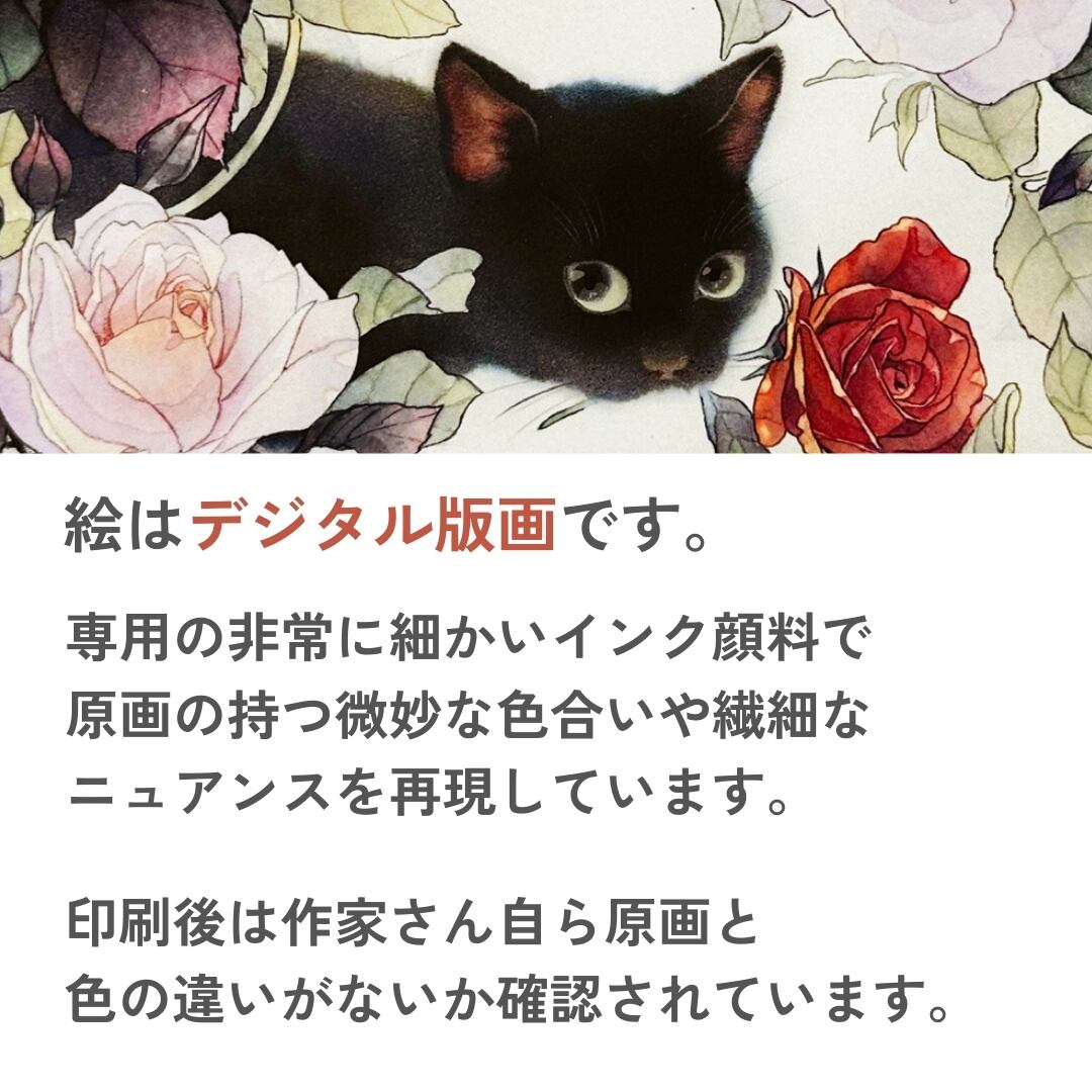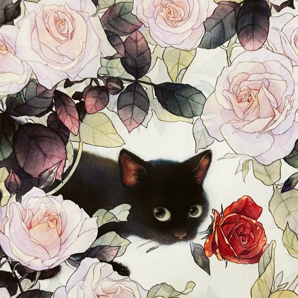 柔らかな色調のバラに囲まれ、ひっそりと佇む黒猫の姿が印象的な作品です。薄紅色や紫がかった花びらが繊細に描かれ、透明水彩ならではの柔らかなグラデーションが優雅な雰囲気を漂わせています。その中に潜む黒猫は、つぶらな瞳でこちらを見つめ、可愛らしさと同時に神秘的な存在感を放ちます。淡いバラと黒猫のコントラストが絶妙で、花々の香りや静かな空気感までも伝わってくるようです。和の美意識を感じさせる、心を和ませるアート作品です。