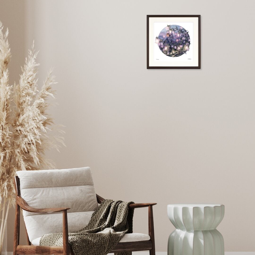 紫がかった花々と柔らかな光の演出は、空間に落ち着きと幻想的な雰囲気をもたらします。飾る場所によって印象は変わり、リビングでは温かな癒しを、寝室では静かな安らぎを与えてくれます。和の要素を含みながらもモダンな印象を持つため、和室だけでなく洋風のインテリアにも自然に馴染みます。光を感じるような透明感のある表現が、観る人の心に穏やかな余韻を残すこの額入りアートは、日常をより豊かに彩る存在となるでしょう。