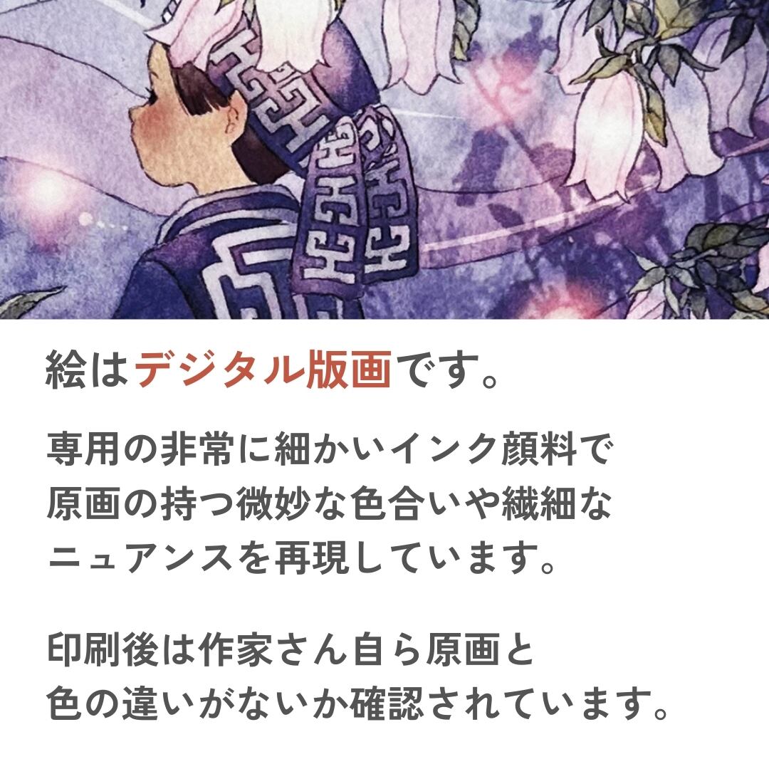 淡い紫色のホタルブクロの花々が、静かな夜の幻想的な光景を描き出しています。花の間に灯る光は、蛍の儚い輝きを思わせ、作品全体に柔らかな温もりを添えています。伝統的な文様を纏った人物の横顔は穏やかで、自然と共に生きる姿を象徴しているかのようです。透明水彩と絵墨の重なりが、光と影の繊細な調和を生み、どこか懐かしい和の空気感を漂わせます。幻想性と静謐さが共存する、心に深く響くアート作品です。