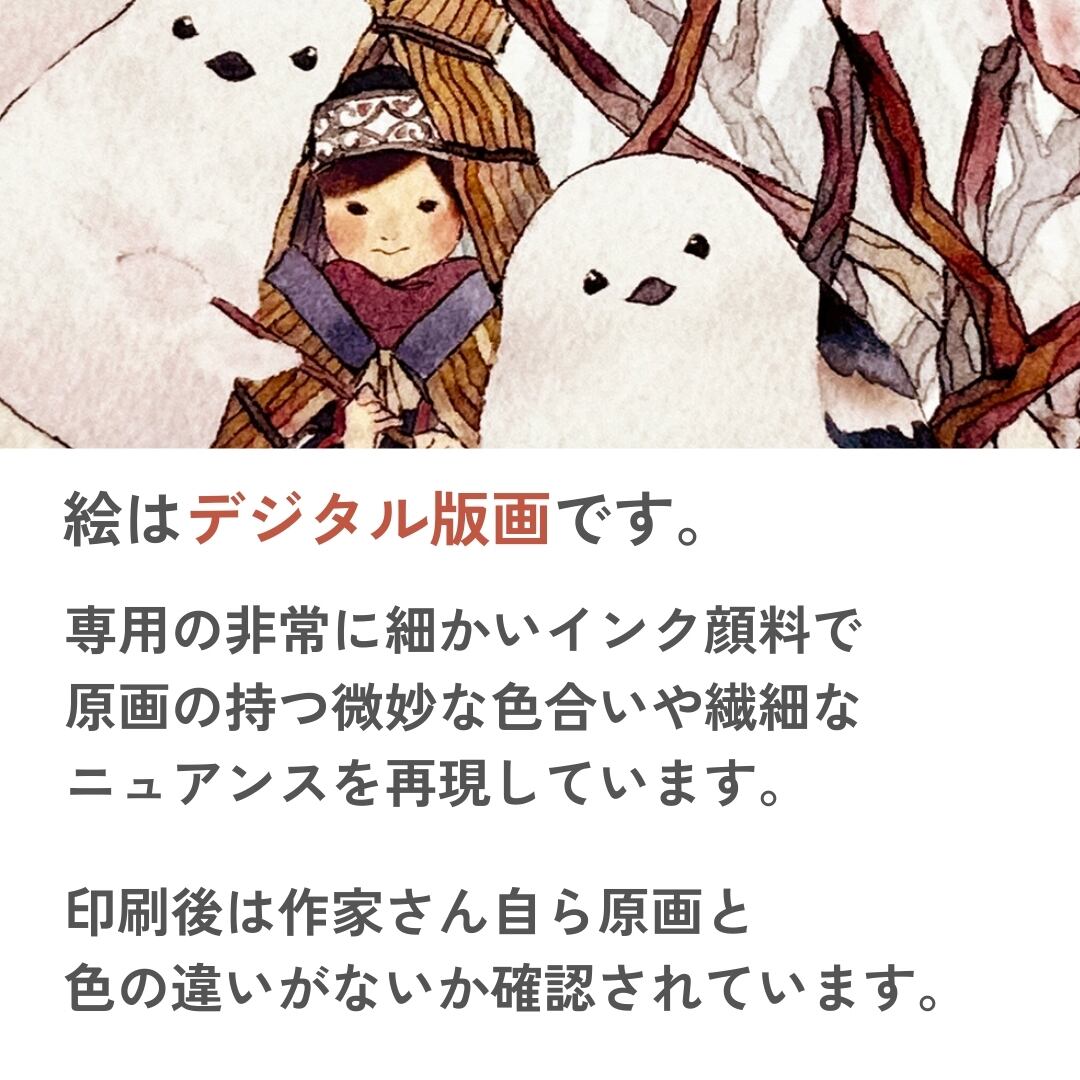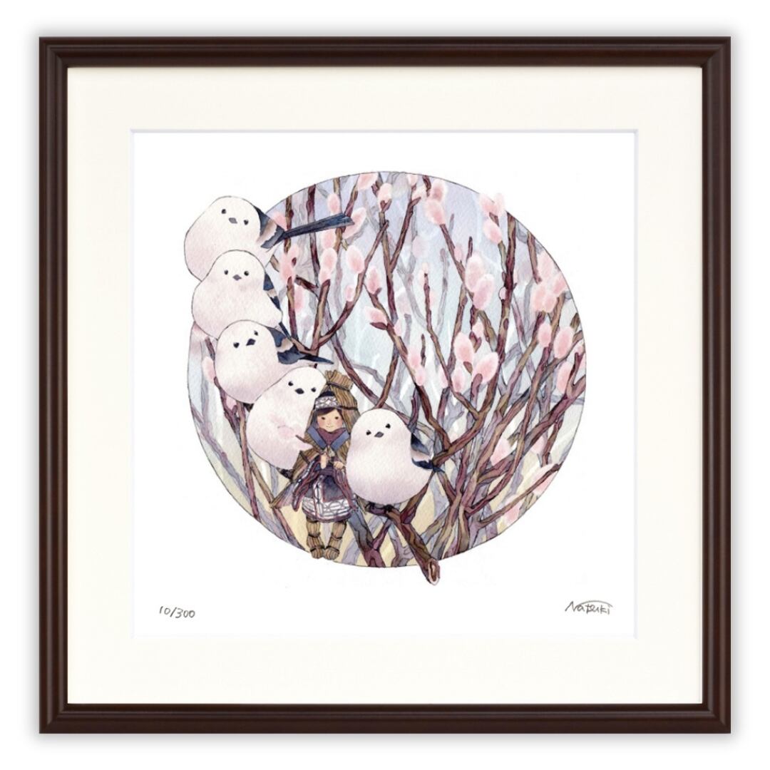 ふわふわとした猫柳の枝に、雪の玉のように丸い小鳥たちが寄り添い、傍らには昔ながらの装束をまとった人物が描かれています。透明水彩の淡いタッチで表現された枝と芽のやわらかさが、春の訪れを予感させ、どこか懐かしいぬくもりを漂わせます。まるで絵本の一場面のような愛らしい構図で、自然と人と動物の調和が温かく伝わってきます。静けさの中に生命の息吹を感じさせる、やさしい和の世界観が広がる作品です。