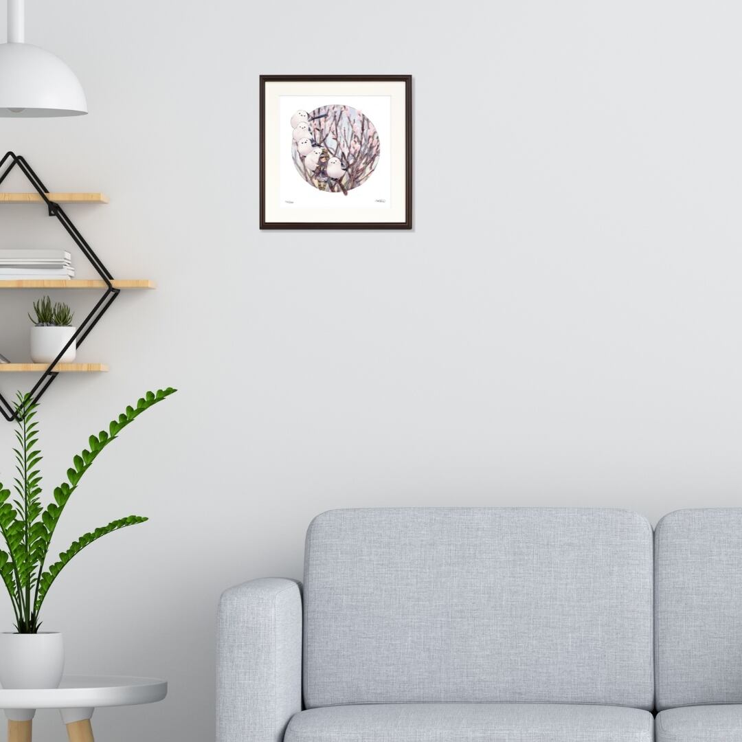 丸く愛らしい小鳥と柔らかな猫柳の枝の表現は、インテリアに穏やかさと微笑みを添えます。明るく優しい色調が壁面に柔らかく溶け込み、リビングや子供部屋では和やかな空気を、和室では落ち着いた四季の情緒を演出します。可愛らしさと和の趣が共存しているため、モダンにもクラシックにも馴染む一枚です。飾ることで日常に小さな物語と安らぎを与えてくれる、心を和ませるアート作品です。