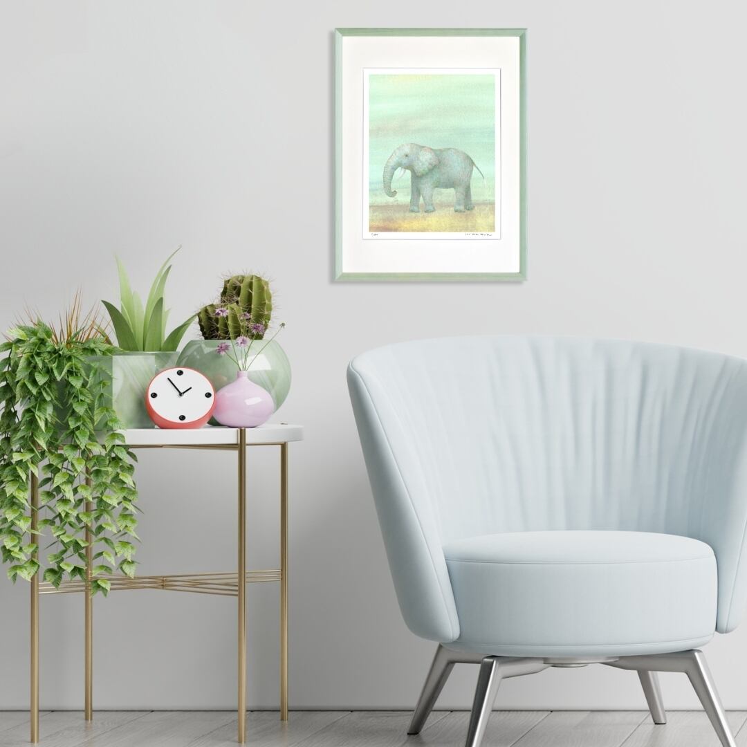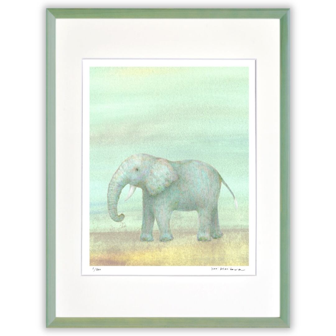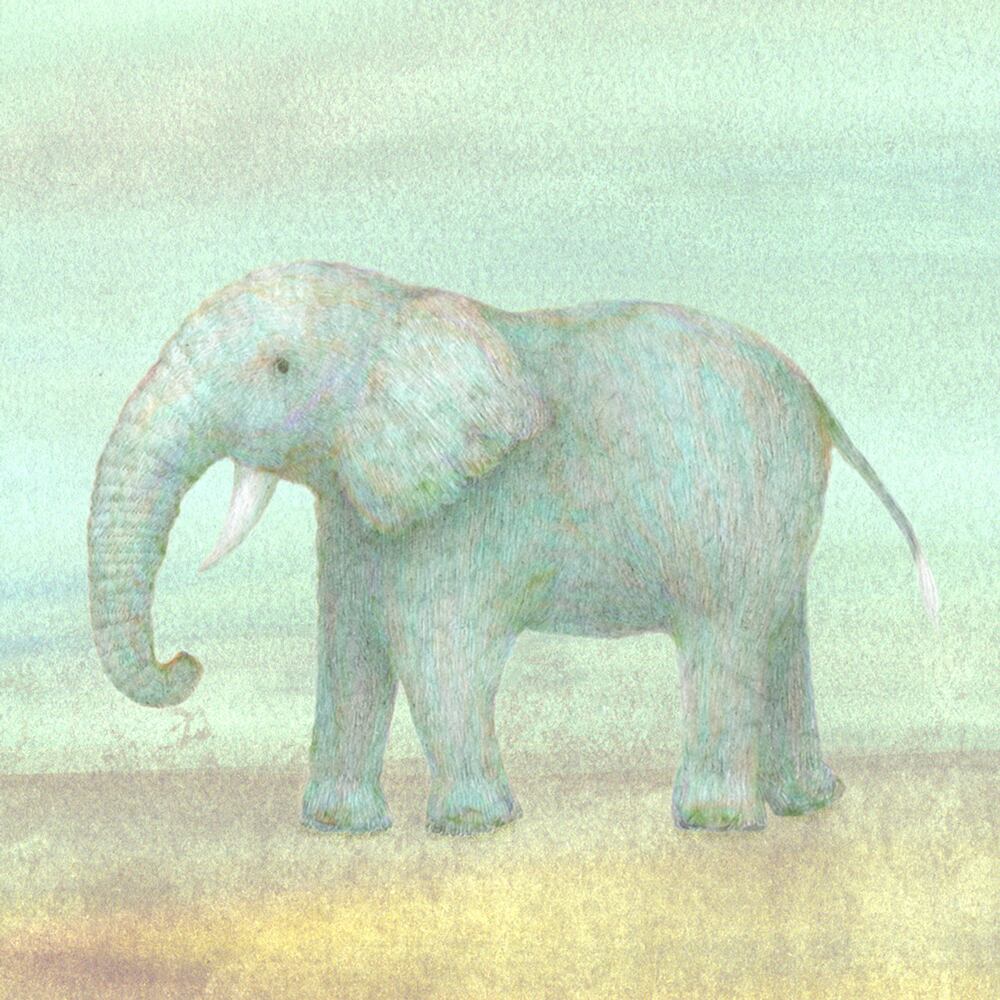 淡いグリーンとベージュのグラデーションの中に、静かに立つゾウの姿。どこか遠い地の穏やかな風を感じさせるような、やさしく静謐な時間が流れています。繊細なタッチで描かれた毛並みや、淡い光の表現が心地よく、まるで柔らかな空気に包まれているかのようです。余白の美を生かした構図が、見る人の想像を広げ、ゾウが歩む先にある“オアシス”を心の中に描かせてくれます。温かさと孤高が共存するこの一枚は、静かな希望を感じさせる作品です。