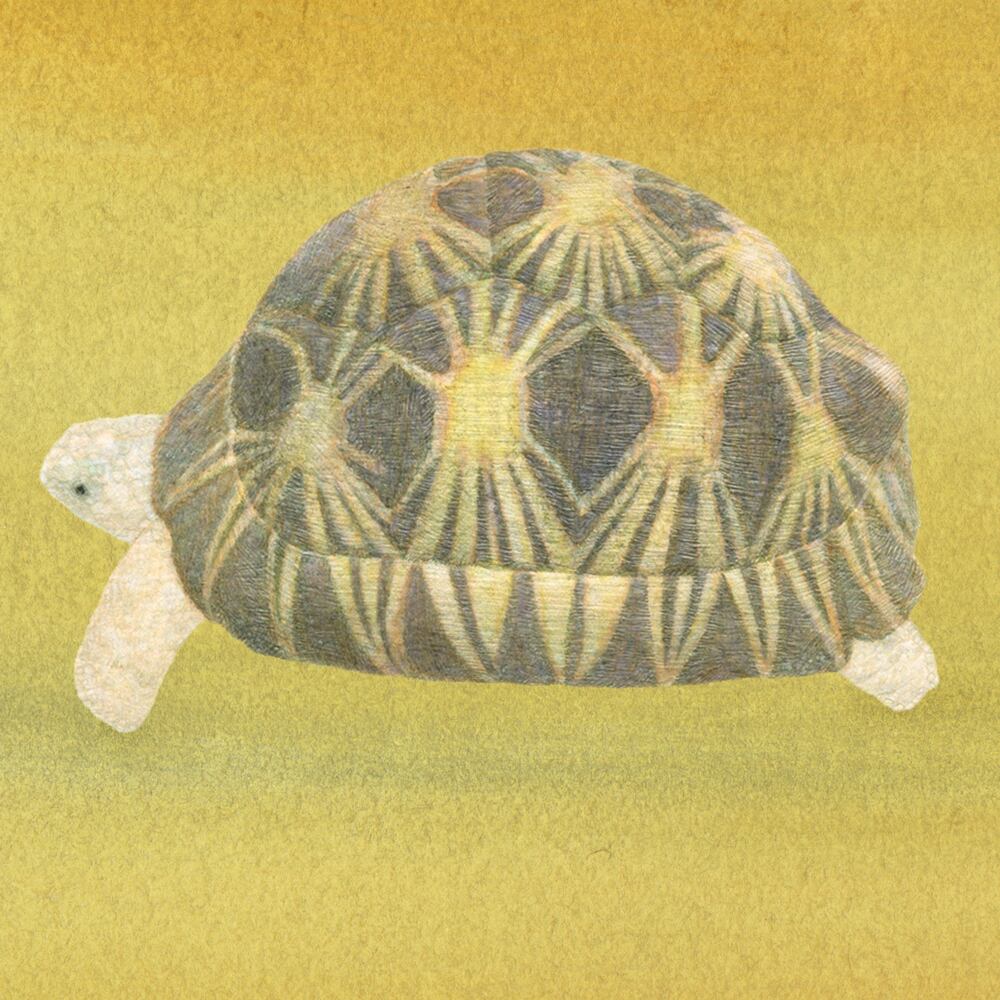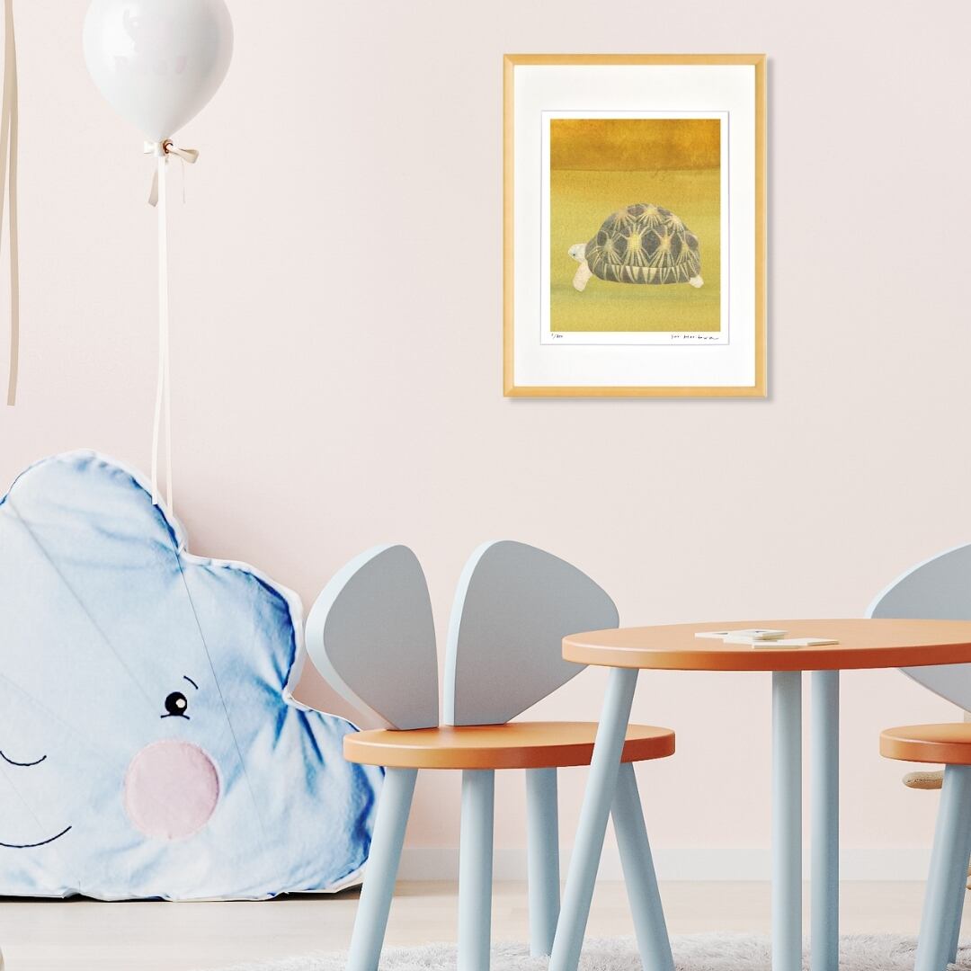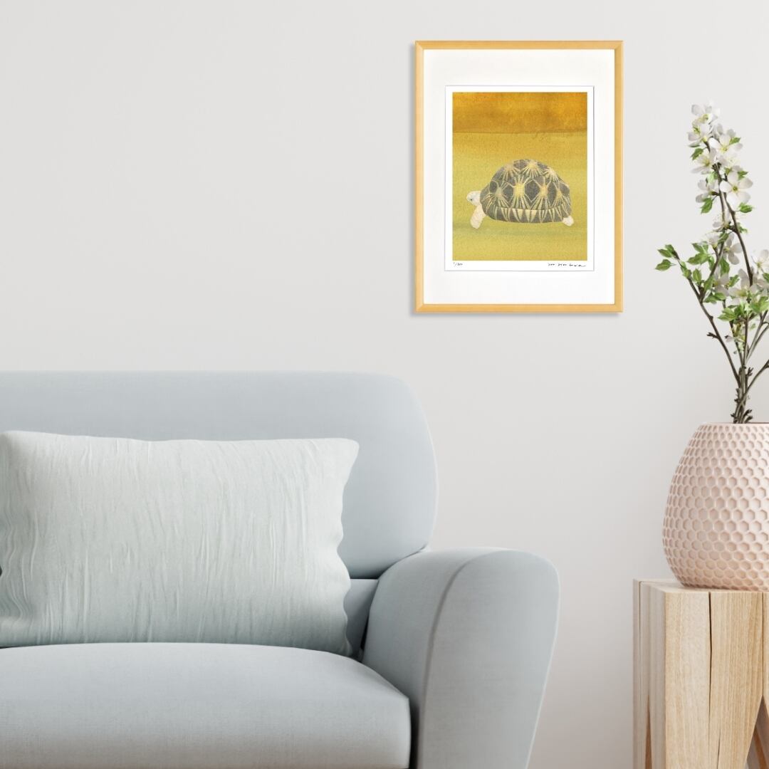 柔らかな黄の世界の中を、静かに歩む一匹のカメ。背景のグラデーションはまるで陽だまりのようで、カメのゆったりとした歩みをやさしく包み込んでいます。甲羅の模様は幾何学的でありながら有機的でもあり、自然の美しさと調和の象徴のようです。小さな一歩の中に確かな意思を感じさせる姿は、見る人の心に「焦らなくても大丈夫」という静かな励ましを届けてくれます。穏やかな色彩とやわらかな質感が織りなす世界は、時の流れをゆっくりと感じさせる一枚です。
