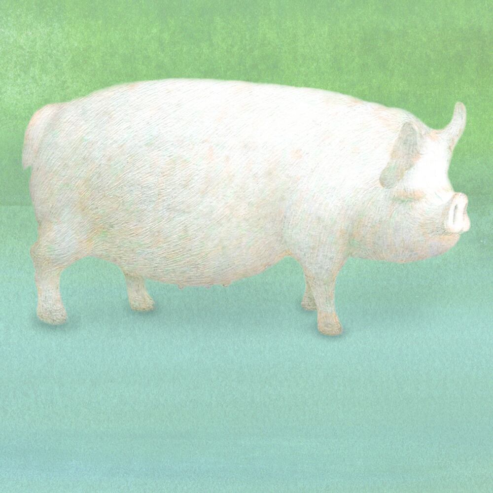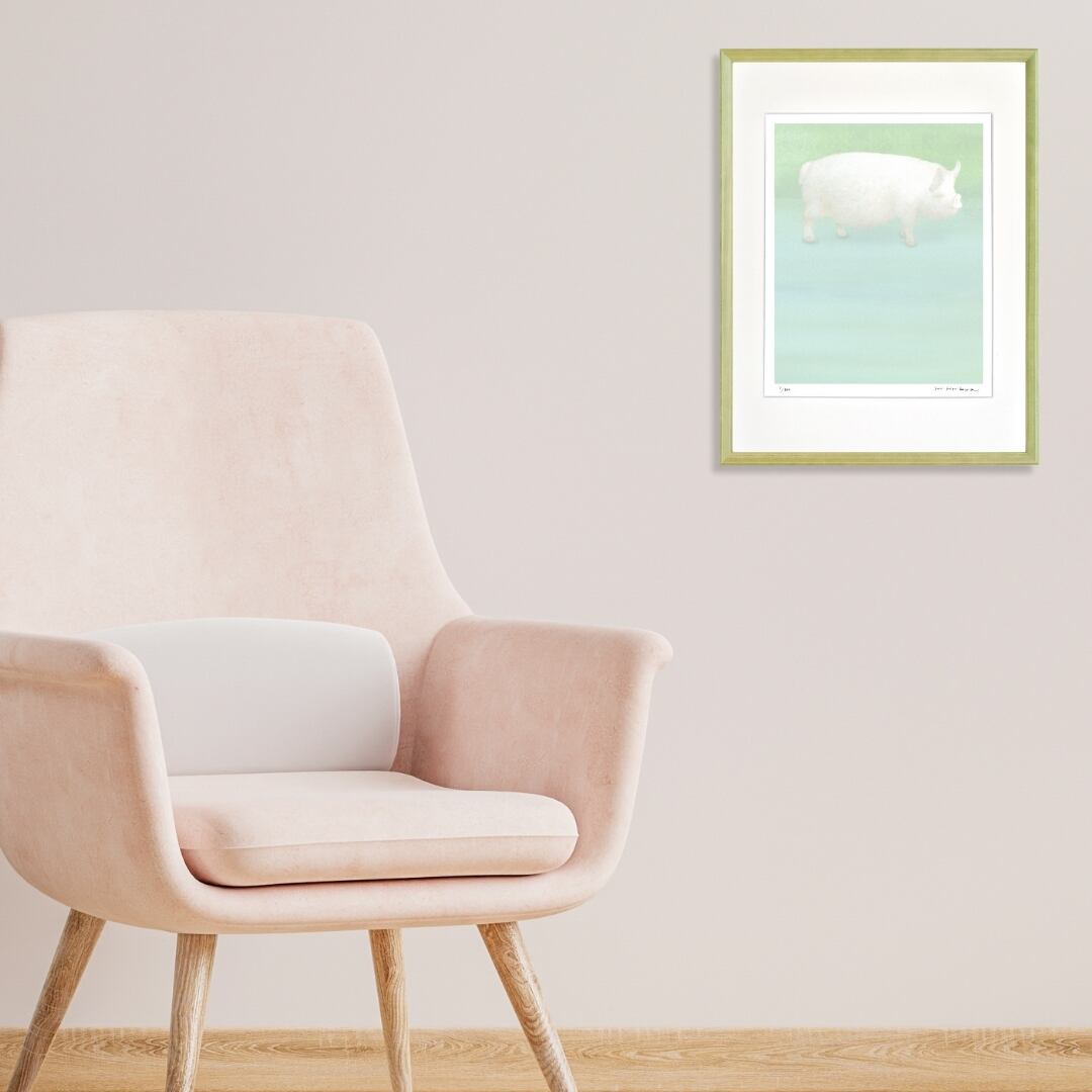 やわらかなミントグリーンの空気の中、白いブタがふんわりと浮かぶように佇んでいます。輪郭は曖昧で、現実と夢の境界が溶け合うよう。まるで静かな午後に見るまどろみの夢のような一枚です。淡い光のグラデーションが画面全体に広がり、見る人の心をやさしく包み込みます。ブタの表情や佇まいにはどこか無垢な温もりがあり、時間を忘れて眺めていたくなる穏やかな魅力に満ちています。