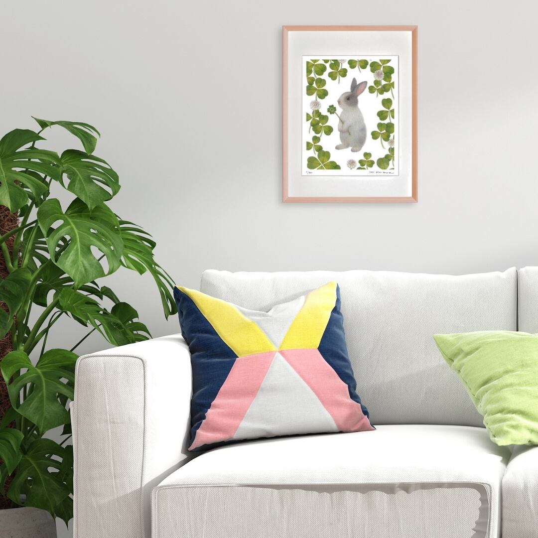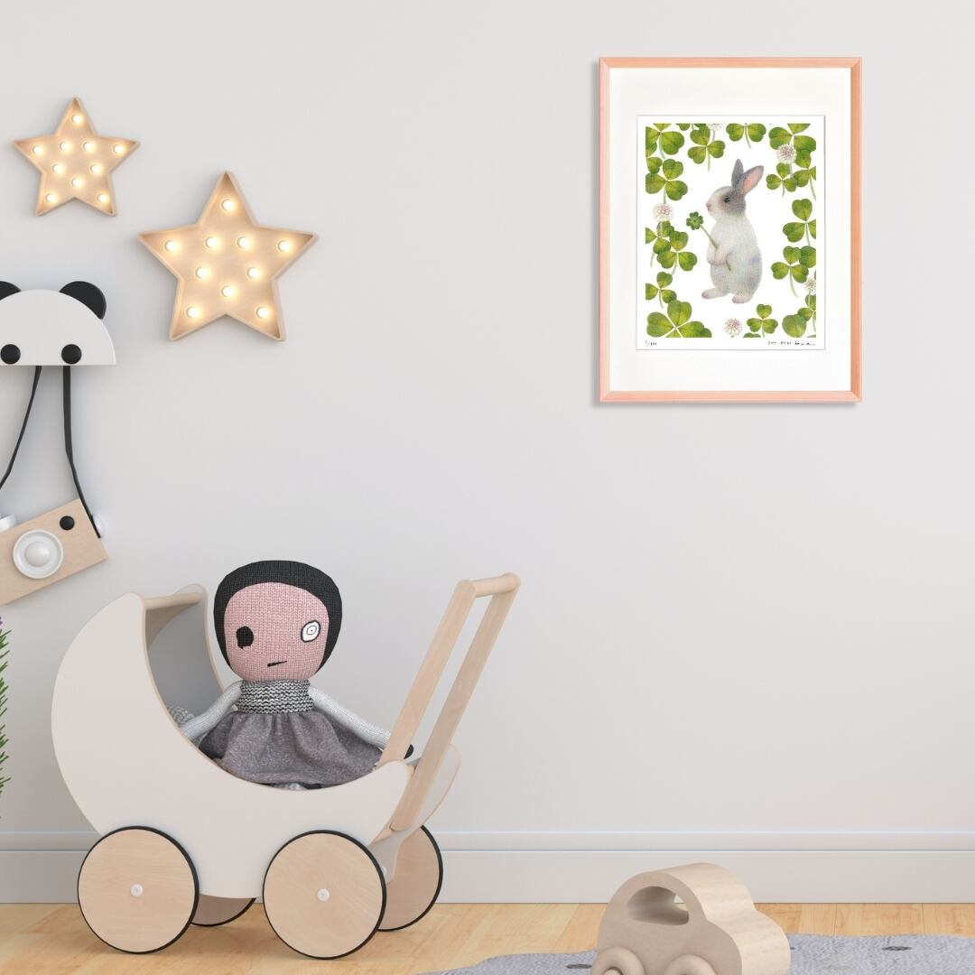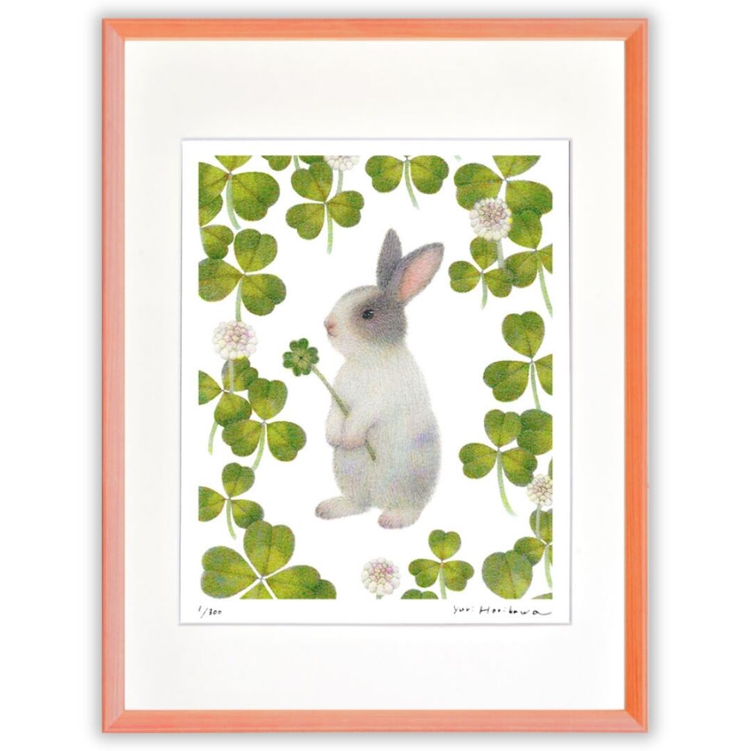 四つ葉のクローバーをそっと抱える小さなうさぎ。その瞳は優しく、まるで大切な願いを胸に秘めているかのようです。背景には瑞々しいクローバーの葉と白い花が柔らかく広がり、作品全体に穏やかな幸福感が満ちています。繊細なタッチで描かれた毛並みや、淡い光のグラデーションは、画家の優しい眼差しを感じさせます。静かな空気の中に希望の光が差し込むような、見る人の心に寄り添う作品です。