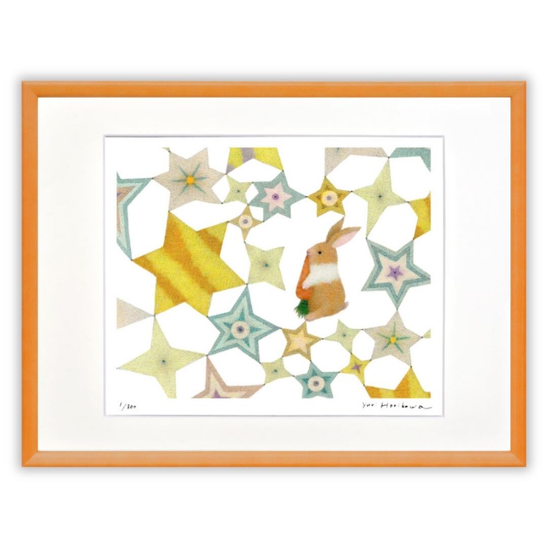 柔らかな色合いの星々に囲まれ、オレンジ色のうさぎが静かに見上げる姿が印象的な作品です。星は一つ一つ異なる表情を持ち、繊細な線で描かれた重なりが幻想的な奥行きを感じさせます。白い余白が清らかさを生み、そこに浮かぶうさぎの存在がより際立ちます。全体から漂うのは、静かな夜の温もりと、どこか懐かしい安心感。光を描くようなタッチで、夢と現実のあわいを表現したこの作品は、見る人の心をやさしく包み込みます。