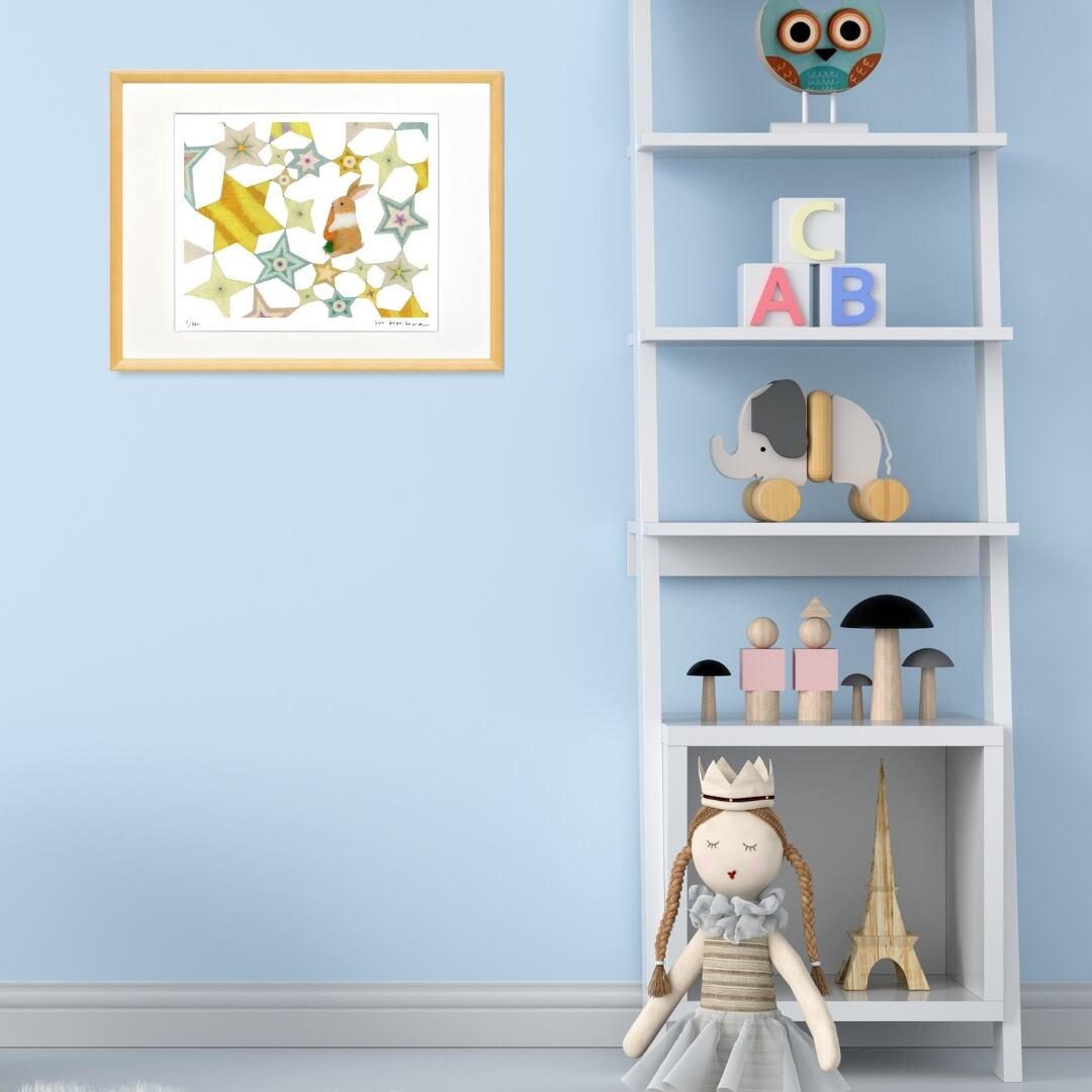 この作品を飾ると、空間にやわらかな光と安らぎが広がります。星のモチーフは希望や夢を象徴し、見るたびに前向きな気持ちを与えてくれるでしょう。優しい色彩がインテリアになじみ、ナチュラルテイストの部屋にも、シンプルモダンな空間にも自然に調和します。寝室やリビングに飾れば、穏やかな夜の時間を演出してくれるインテリアアートとしてもおすすめです。眺めるたびに心がふっと軽くなる、静かな癒しを感じさせる一枚です。