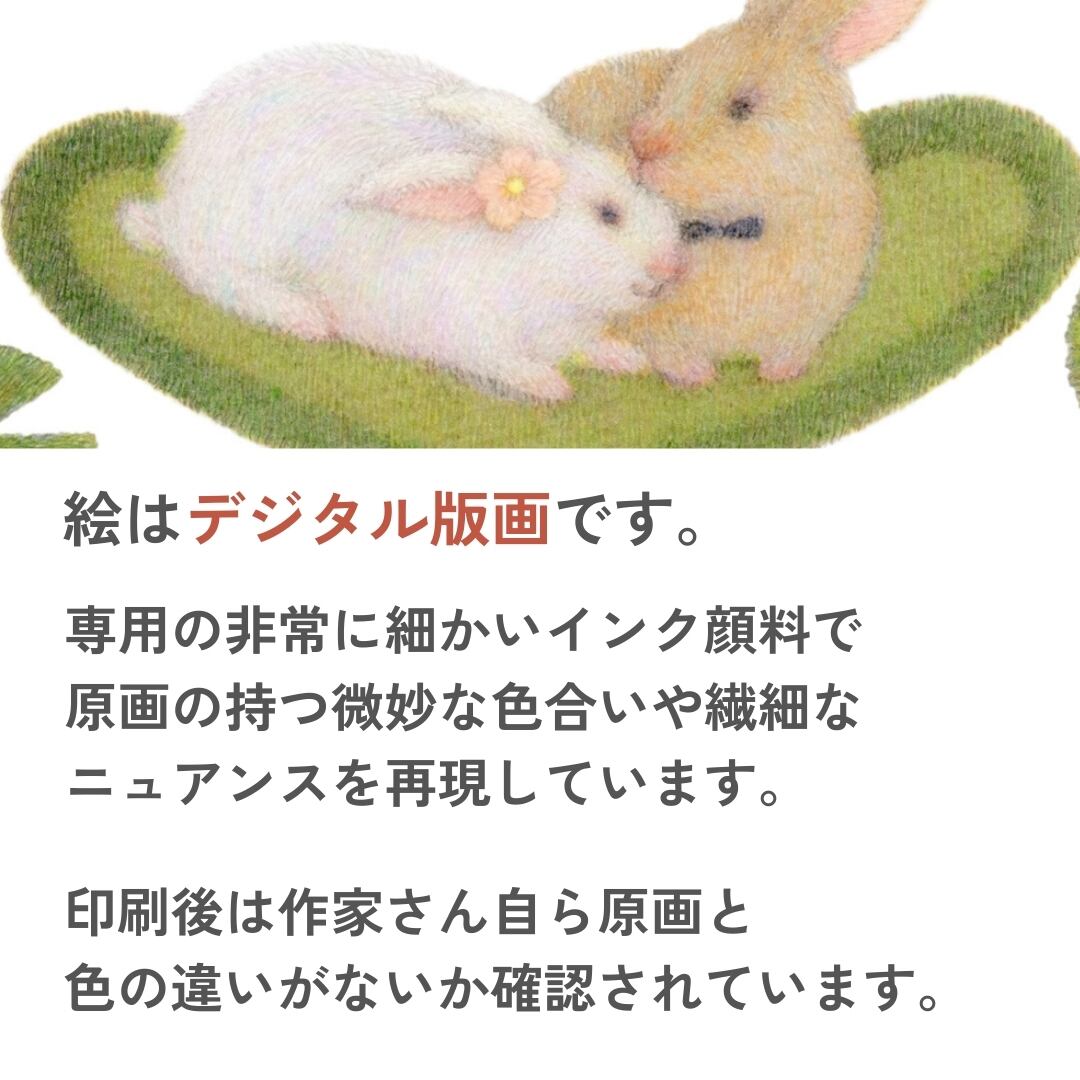 この作品を飾ることで、空間にやすらぎと温もりが広がります。寄り添ううさぎたちの姿は「絆」や「愛情」を象徴し、家族や大切な人とのつながりを感じさせます。ナチュラルな色合いがどんな部屋にも自然に馴染み、見るたびに心が穏やかになるでしょう。静かな時間を過ごしたい寝室や、優しい印象を与えたいリビングにぴったりのインテリアアートです。やさしい光を集めるように、日々の暮らしに穏やかな幸福をもたらしてくれます。