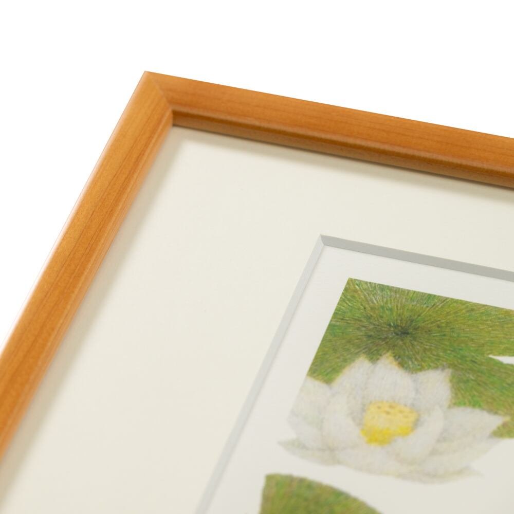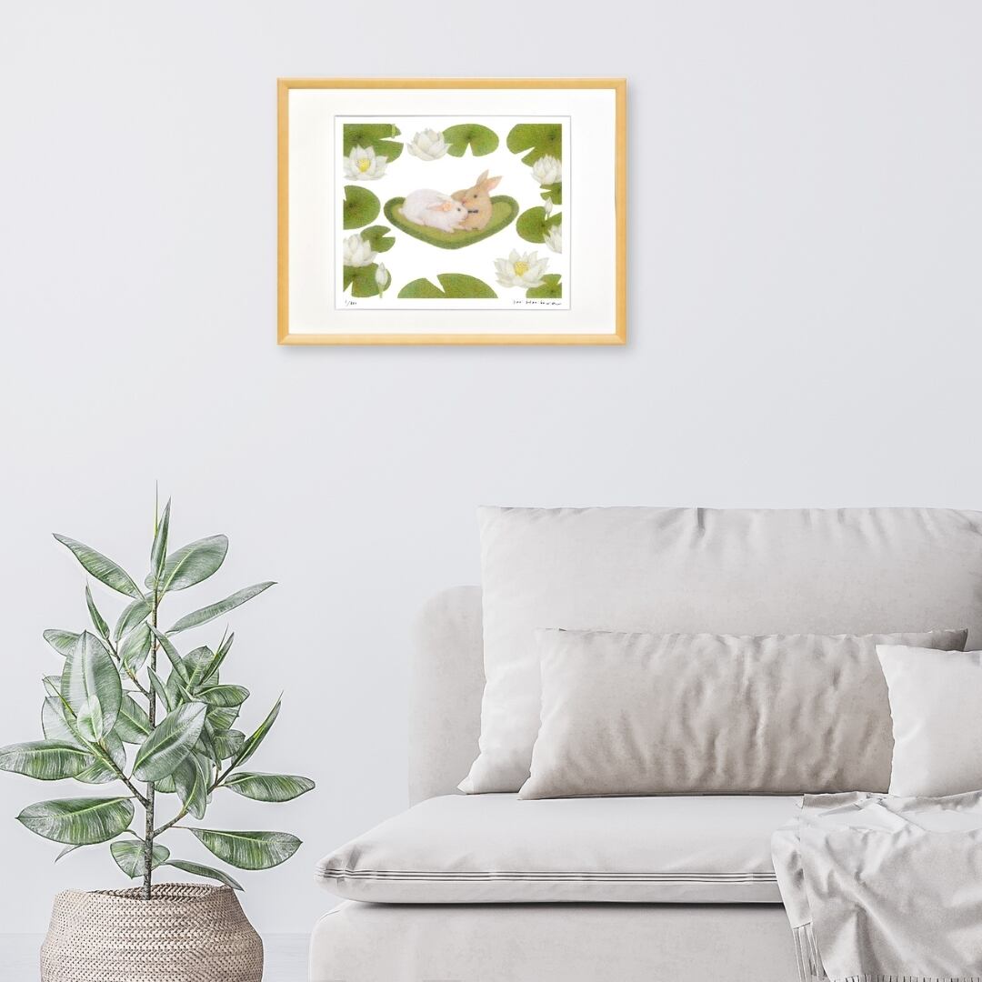 睡蓮の葉の上で寄り添う2匹のうさぎ。静かな水面に浮かぶその姿は、まるで時間が止まったかのような穏やかさに包まれています。白いうさぎは小さな花飾りをつけ、優しく目を閉じ、隣のうさぎに身を寄せています。淡い緑と白の繊細なグラデーションが、水の透明感や柔らかな空気を感じさせ、静寂の中にも温もりを宿しています。筆の重なりが生む柔らかな毛並みや、睡蓮の葉の緻密な表現が見事で、見る人の心に優しく寄り添うような作品です。