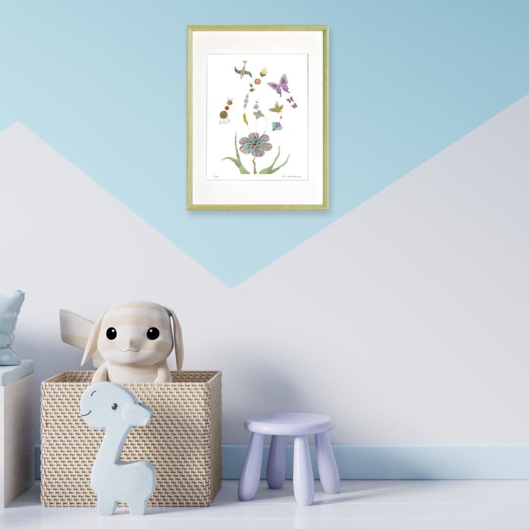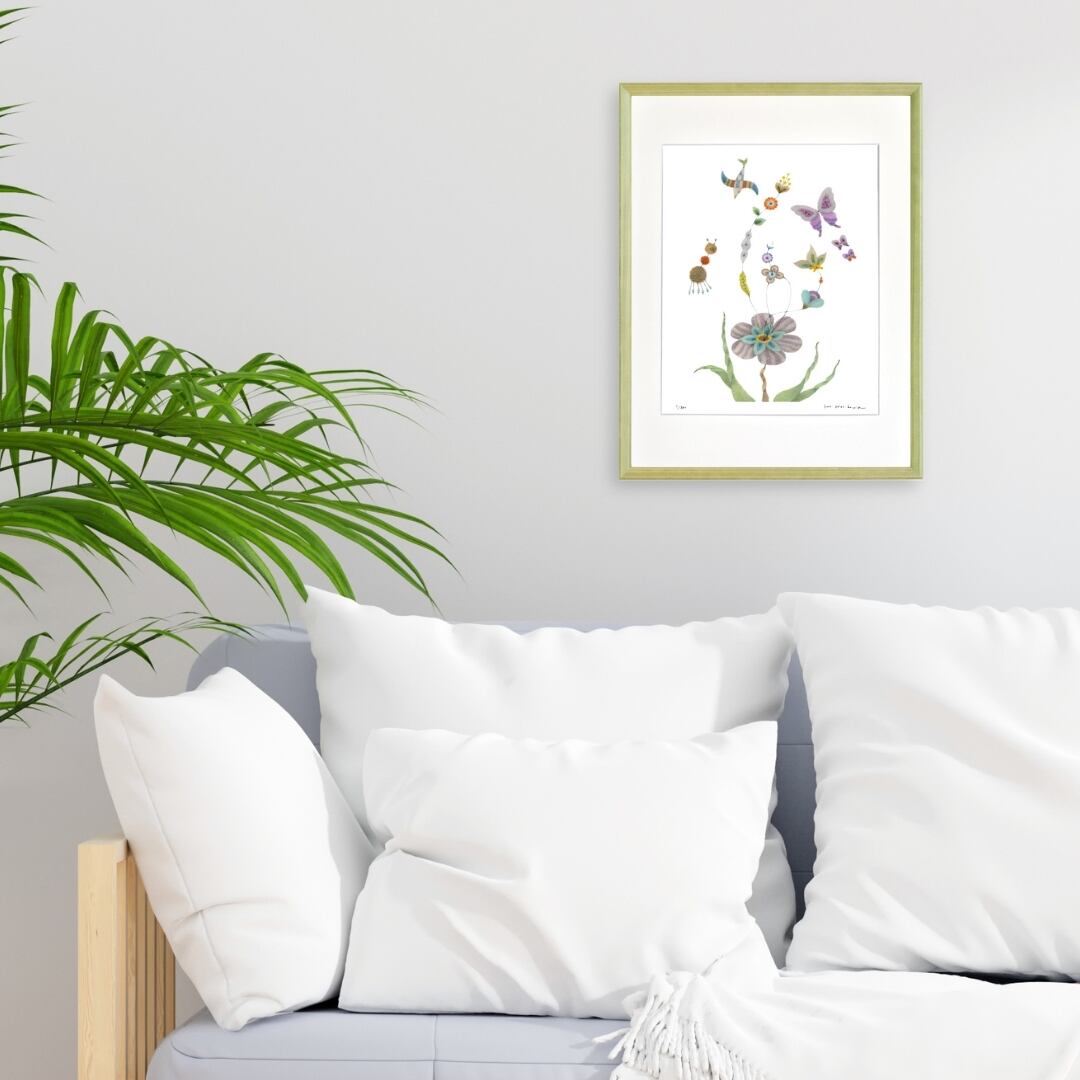 この作品を飾ると、部屋全体がやわらかく澄んだ空気に包まれます。淡いトーンの花と蝶のモチーフが、空間に優しい動きを与え、見るたびに穏やかな気持ちをもたらします。白やナチュラルカラーの壁に特に映え、リビングや玄関などに爽やかな彩りを添えてくれるでしょう。控えめながらも印象的な構図は、日常にそっと詩情を運ぶインテリアアートとして最適です。忙しい日々の中でも、ふと深呼吸したくなるような安らぎを感じさせてくれます。