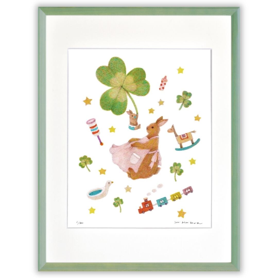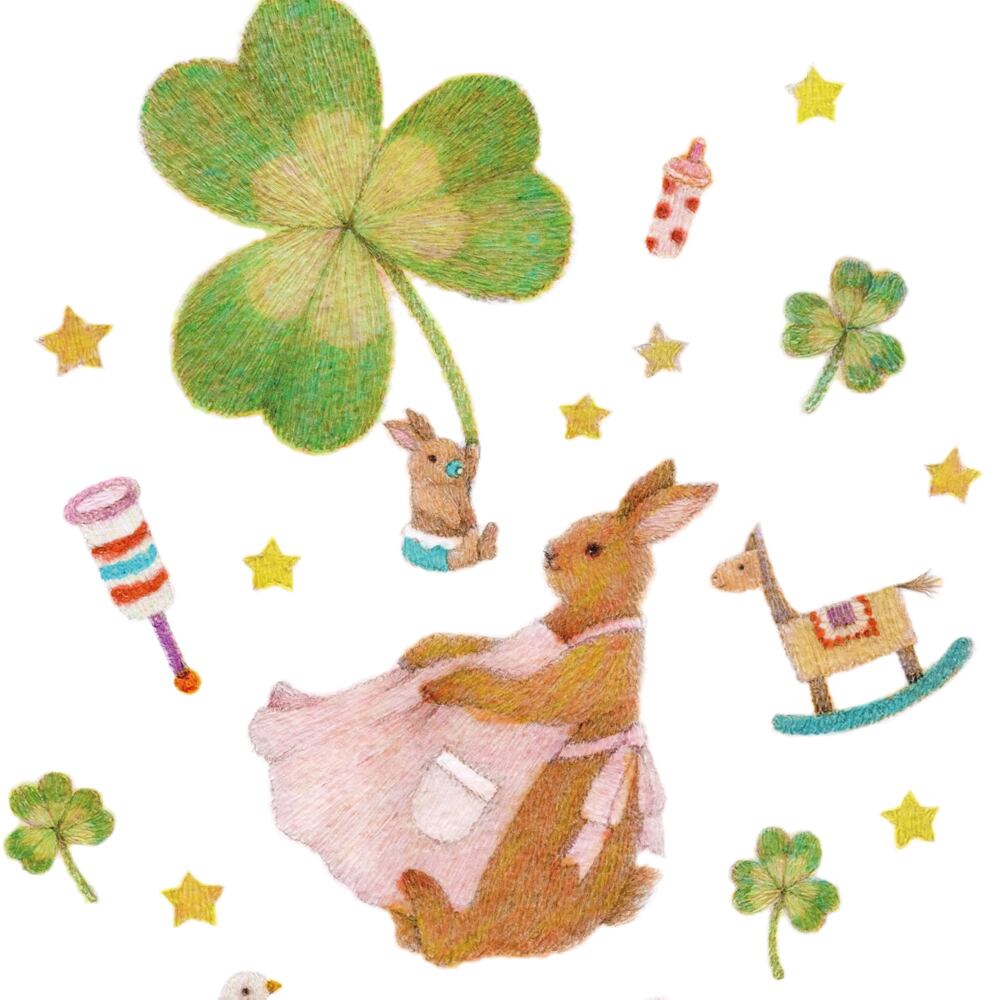 お母さんうさぎがそっと子うさぎを抱きしめるように、やさしいまなざしを向ける姿が描かれています。まわりには四つ葉のクローバーや星、木馬や汽車のおもちゃが浮かび、夢の中のような温もりある世界が広がります。淡いピンクやグリーン、黄色が重なり合い、柔らかく光を含んだような質感が印象的です。母と子の絆、見守る優しさ、安心して眠れるぬくもり――そんな普遍的な愛情を、繊細な筆致と淡い色彩で表現した作品です。見るたびに心の奥がほっと温かくなります。
