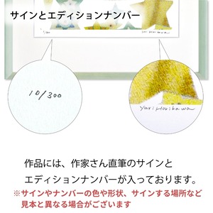 図柄ごとに作家のサイン、エディションナンバーつきの版画作品で数量限定販売になっています。