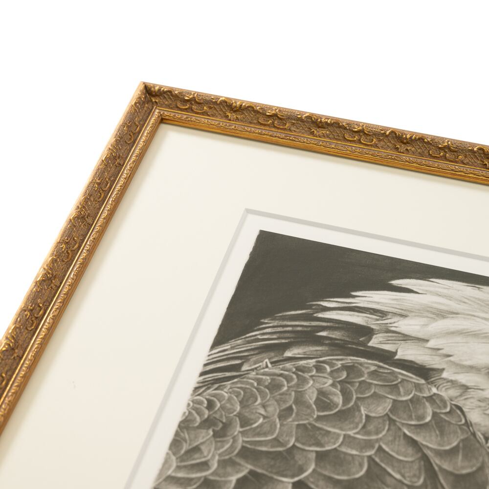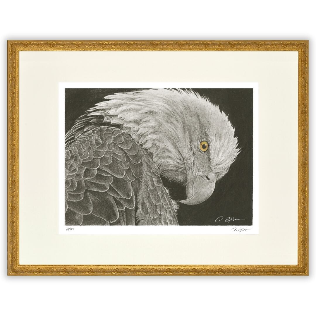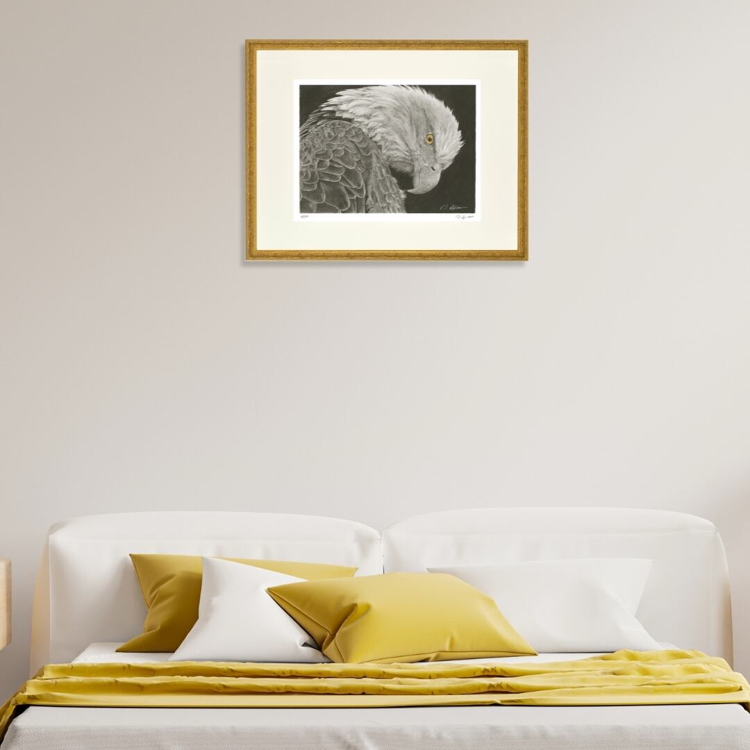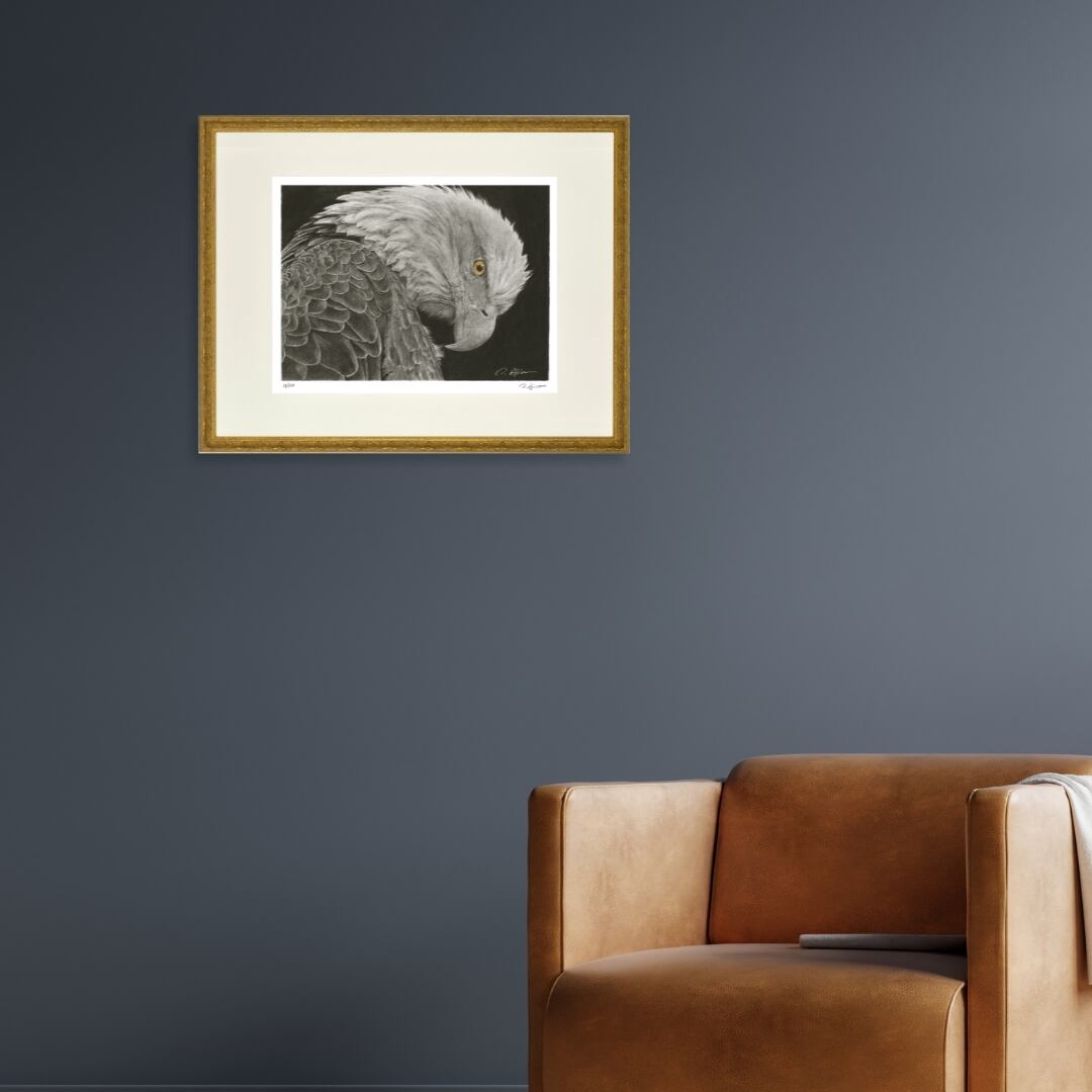 鉛筆画の極致ともいえる繊細なタッチで描かれたオジロワシの横顔。羽根の一枚一枚まで丹念に表現された質感は、まるで実物を目の前にしているかのような迫力を放ちます。モノクロームの中に浮かび上がる黄金の瞳が、圧倒的な存在感を生み出し、静寂の中に宿る力を感じさせます。イラストでありながらも、芸術作品としての緻密な構図と陰影の美しさが際立つ一枚。堂々とした佇まいの中に誇りと知性が宿る、見る者の心を深く惹きつけるインテリアアートです。
