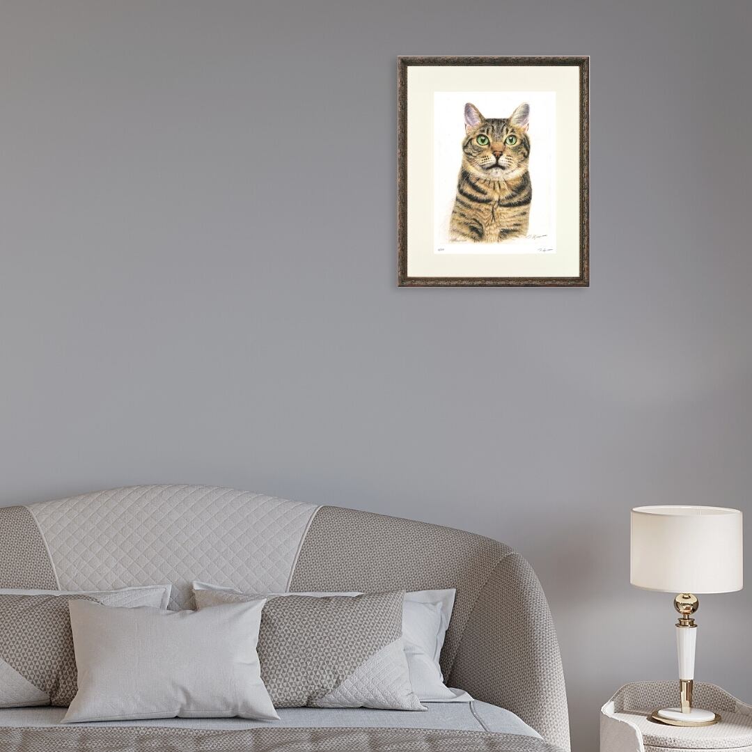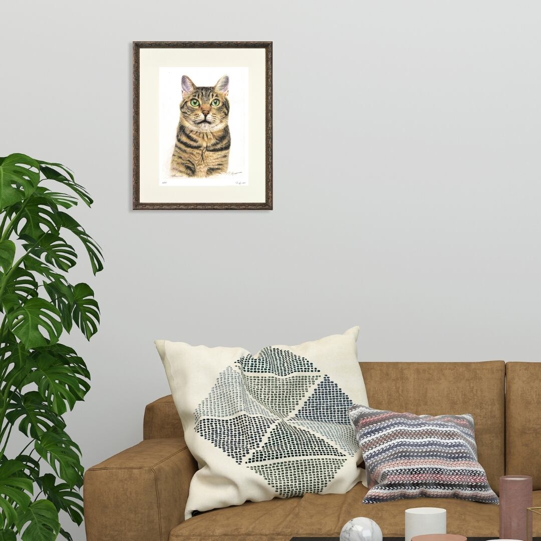 鉛筆と淡い色彩で丁寧に描かれたトラネコの肖像が、温かみとリアリティを同時に感じさせるインテリアアート。柔らかな毛並みの質感や光沢、凛とした瞳の輝きまで細密に表現され、まるで今にも動き出しそうな生命感に満ちています。真っ直ぐにこちらを見つめる大きな緑の瞳が印象的で、穏やかさと誇りを併せ持つ猫の魅力を見事に捉えています。イラストの繊細なタッチとアートとしての構成美が融合し、見る人に癒しと優しさを届けてくれる作品です。